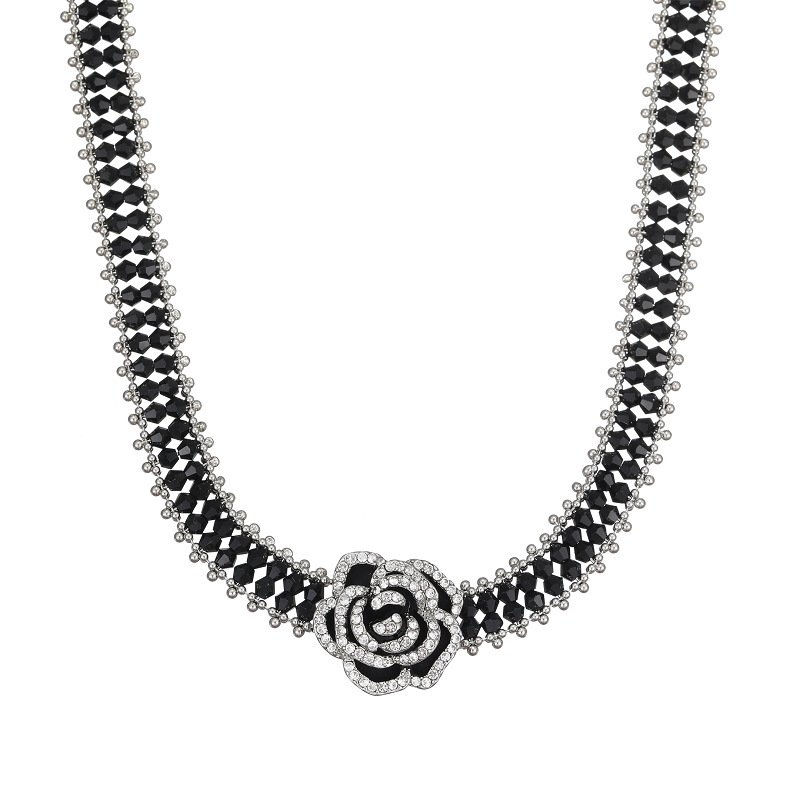 Wholesale Black Camellia Zircon Jewelry Set for women, featuring a black zircon flower choker and a vintage black camellia necklace and bracelet, made from white gold plated copper, emphasizing a high-end, light luxury aesthetic from junejewelry.com.