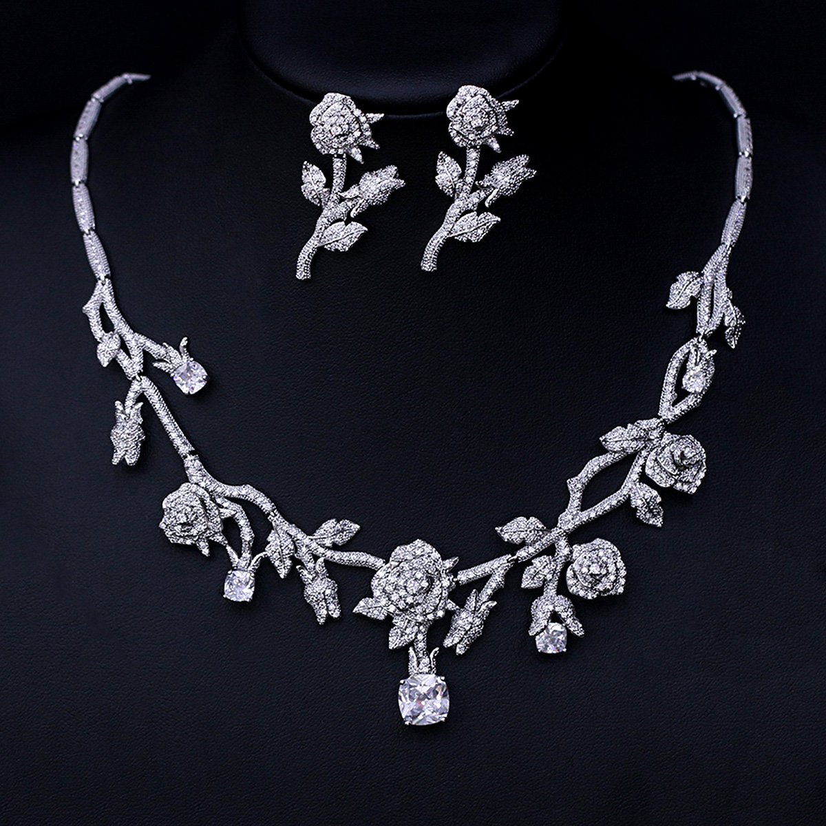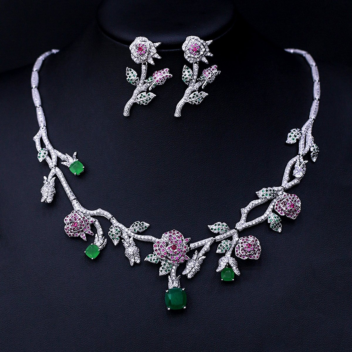 Elegant Floral Cubic Zirconia Necklace and Earring Set in Platinum Plated Brass
