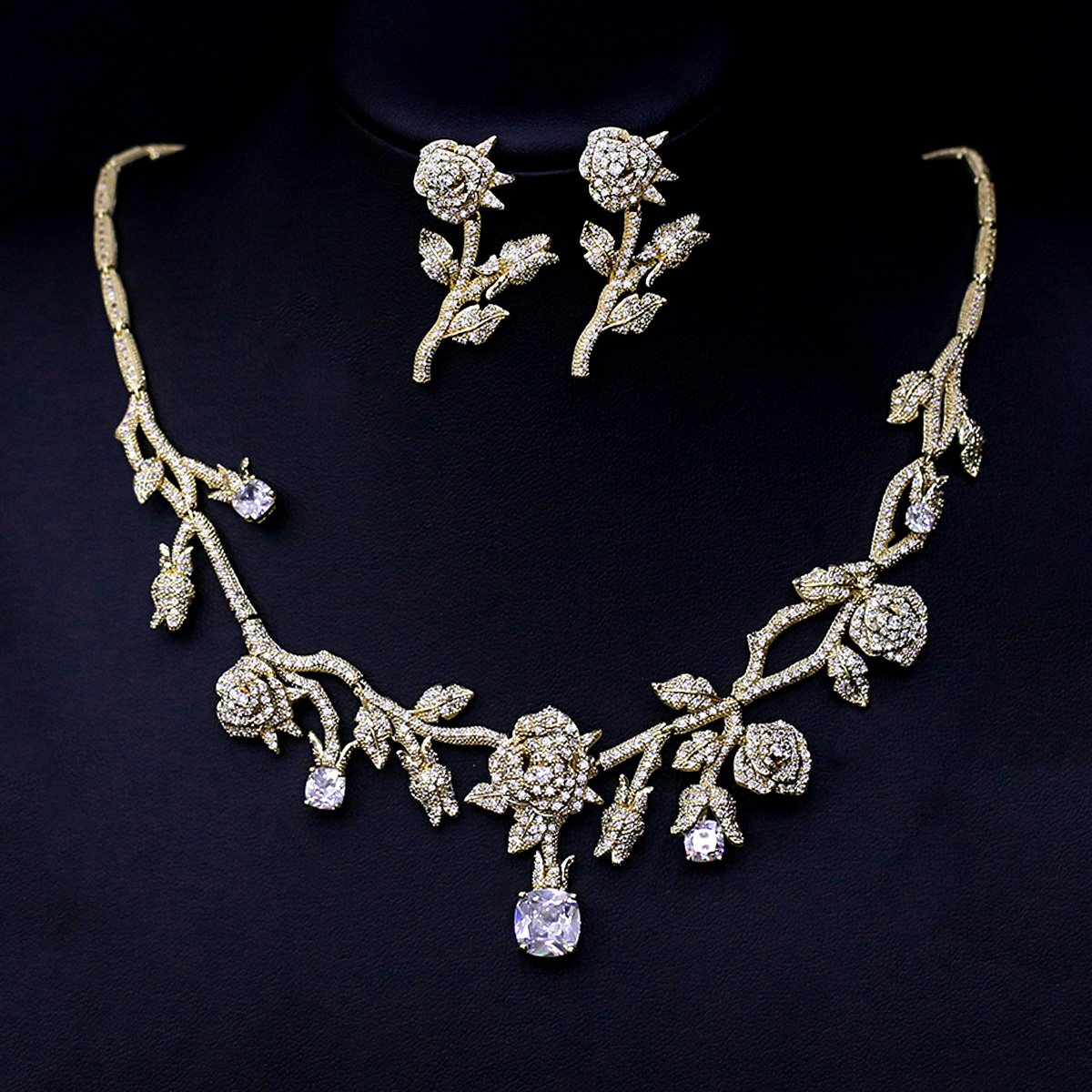 Elegant floral cubic zirconia necklace and earring set with platinum plating on a black background.