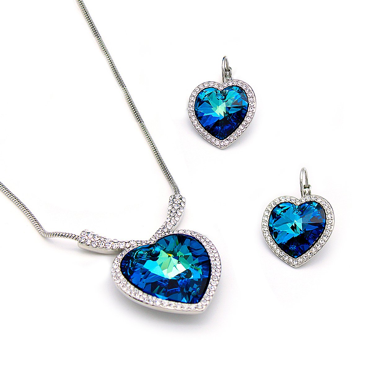 Introduce a touch of sophisticated romance to your collection with the Luxury Heart Crystal Jewlery Set (A500006A). This premium matching set features a stunning, large heart-cut Swarovski Element crystal surrounded by a glittering pave-set frame of small crystals, creating a luxurious halo effect. The set is reminiscent of iconic romantic jewelry pieces like the “Heart of the Ocean.” The dazzling main stone displays a beautiful Blue-Green (Aqua/Teal) gradient, and is available in both radiant 18K Gold Plated and sleek 18K White Gold Plated brass finishes. The combination of the classic heart shape and the brilliant pave detailing makes this set a guaranteed seller for engagements, anniversaries, and special occasion gifting. JuneJewelry.com ensures high quality, original unique designs at highly competitive factory prices. Order in bulk to stock this luxurious, fast-selling style and benefit from free shipping worldwide.