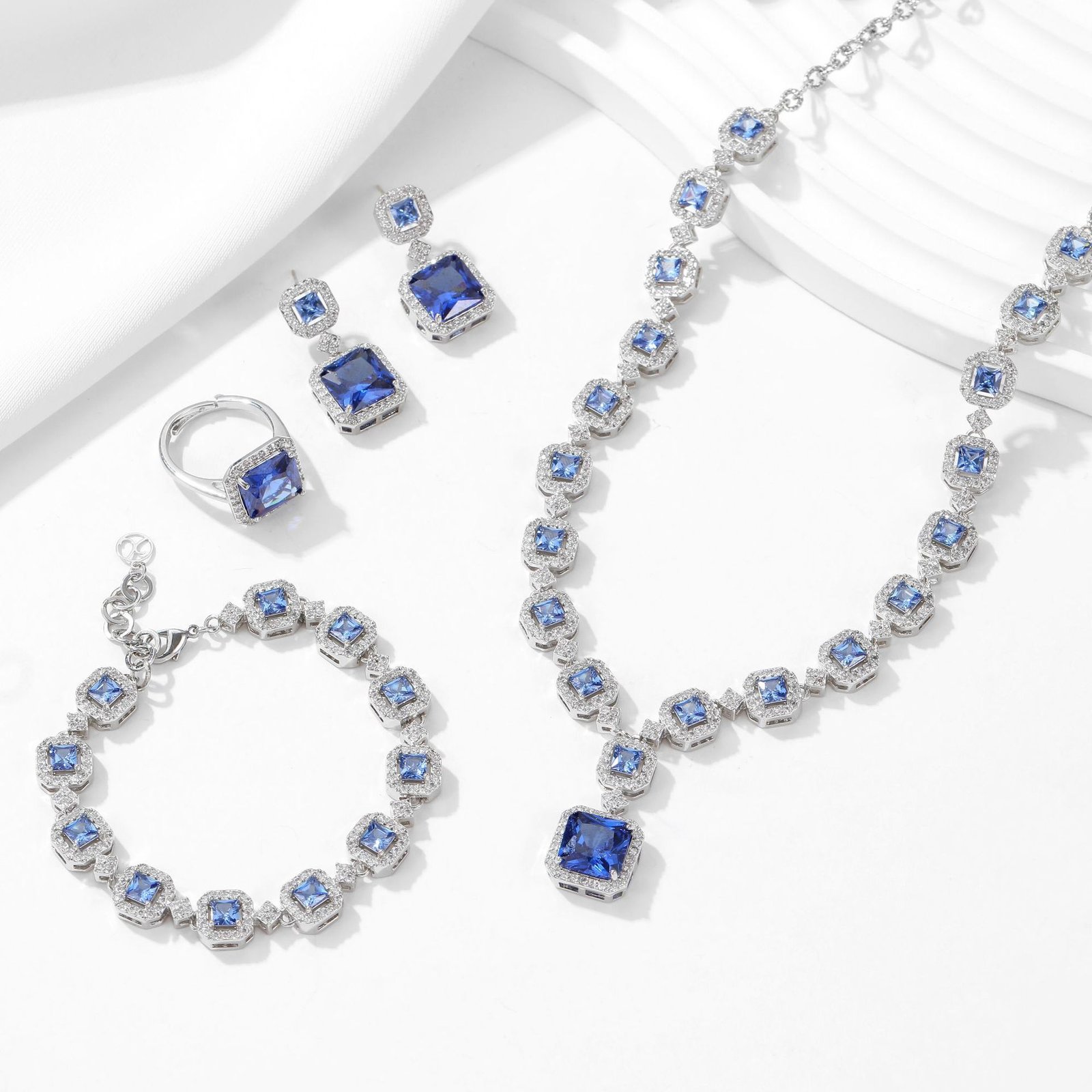 Luxury zircon jewelry set wholesale – white gold plated 4-piece necklace, earrings, bracelet, and ring with geometric zircon stones from JuneJewelry.com.