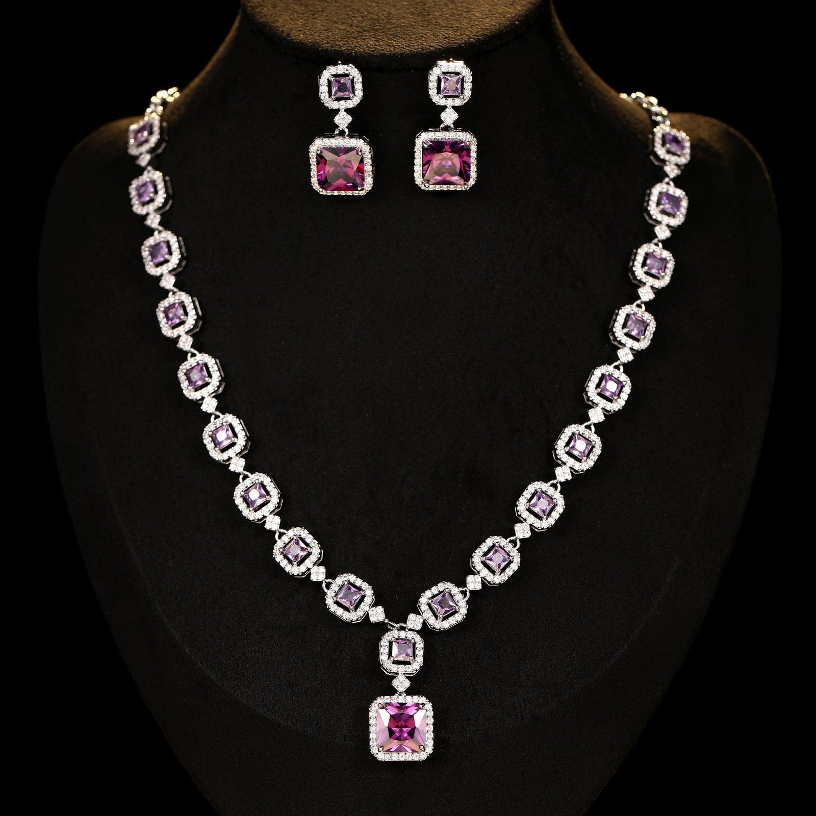 Luxury zircon jewelry set wholesale – colorful zircon earrings and necklace on white gold plated brass, elegant evening jewelry from JuneJewelry.com.