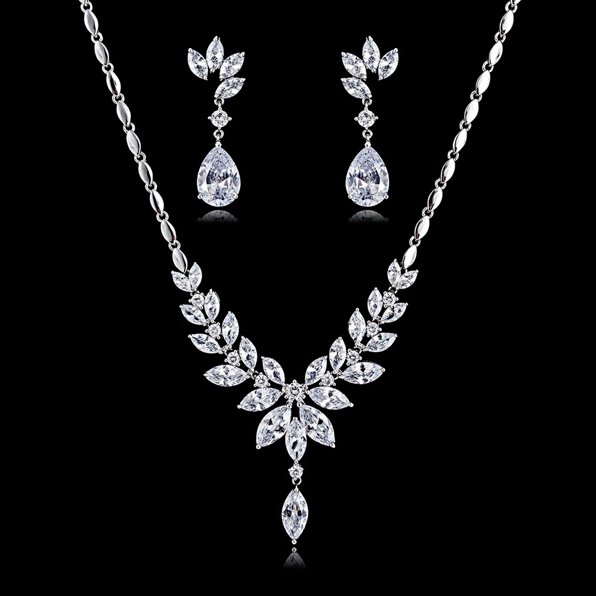 Elegant platinum plated brass necklace and drop earrings set with marquise and pear-cut cubic zirconia stones on a black background.