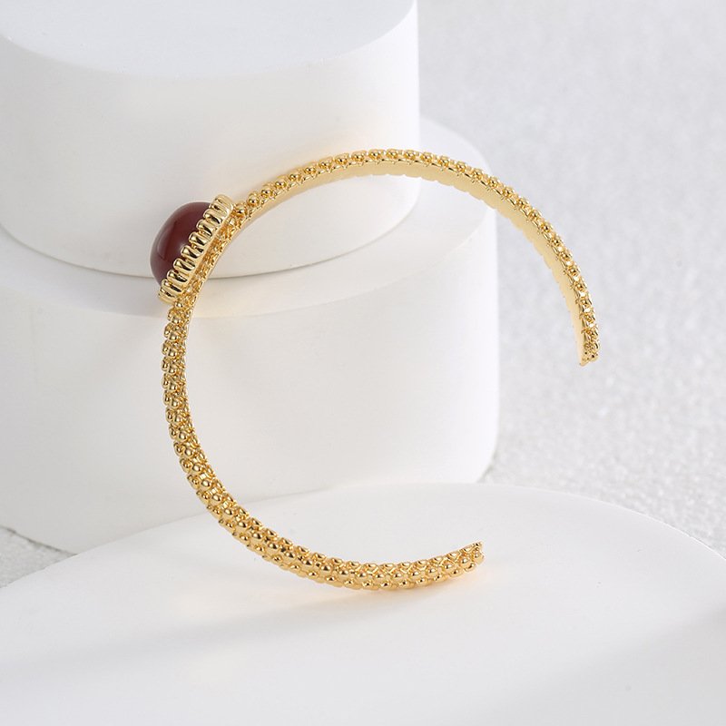 Discover our wholesale red agate cuff bracelet. This minimalist, European-style open cuff design, crafted from 14K gold plated copper, features a sleek red agate stone. This dainty and adjustable bracelet adds a touch of elegant sophistication to any outfit.