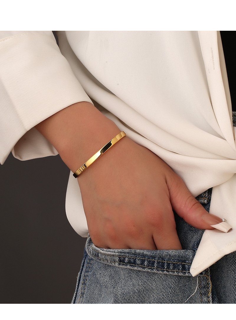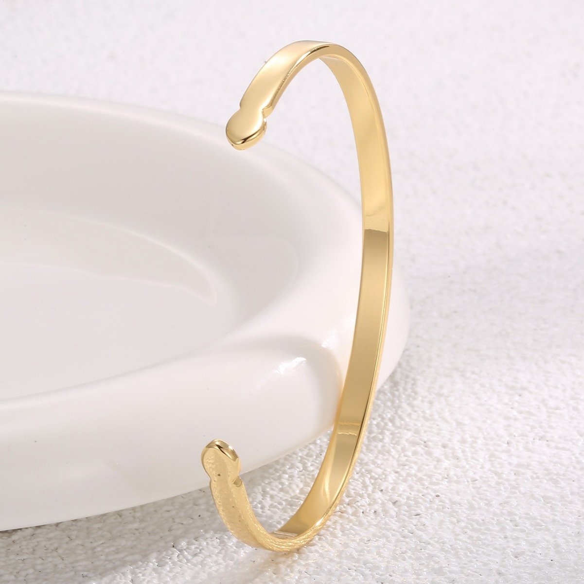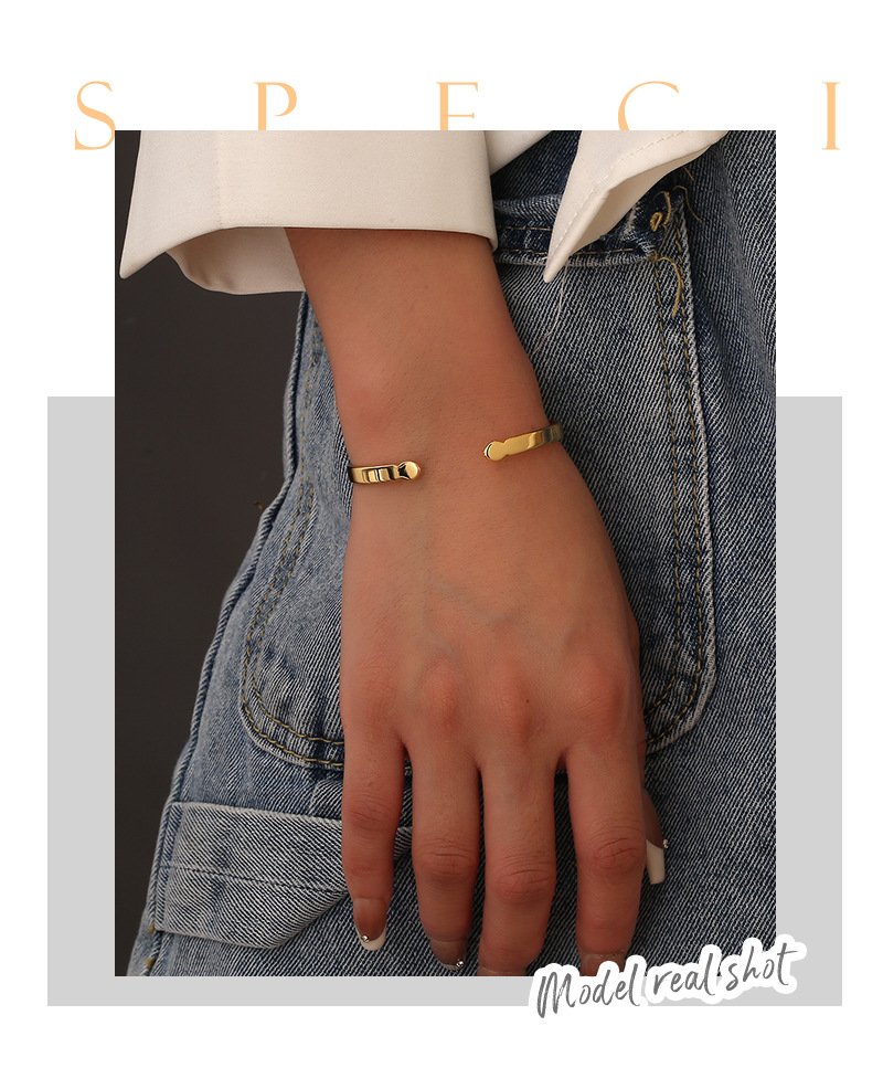 Discover our wholesale arrow cuff bracelet. This minimalist, European-style open cuff design, crafted from 14K gold plated copper, features a stylish arrow design. This chic and adjustable bracelet adds a touch of simple elegance to any outfit.