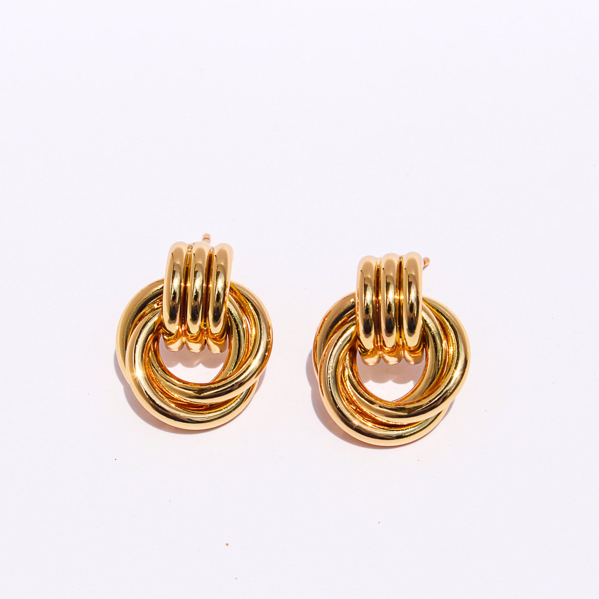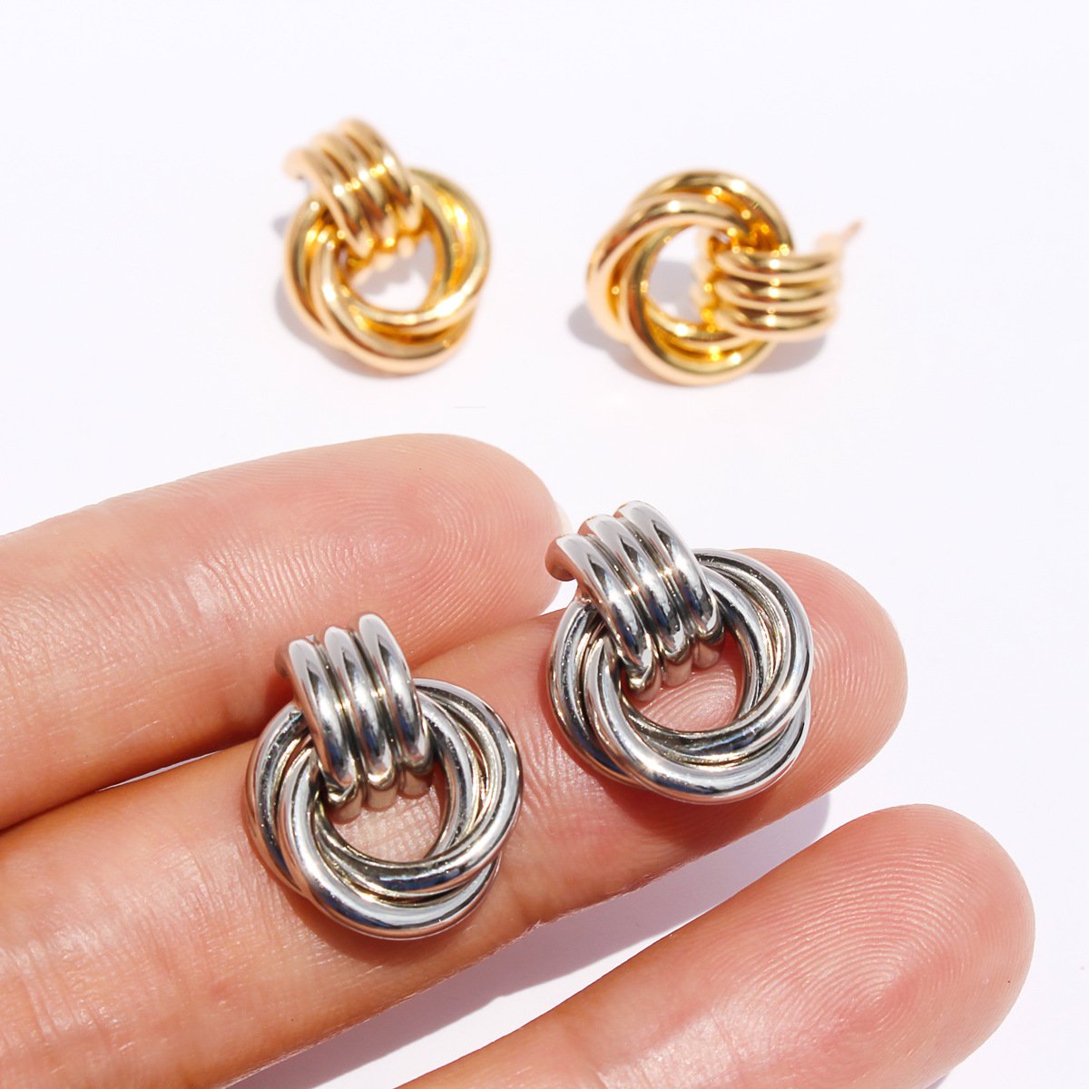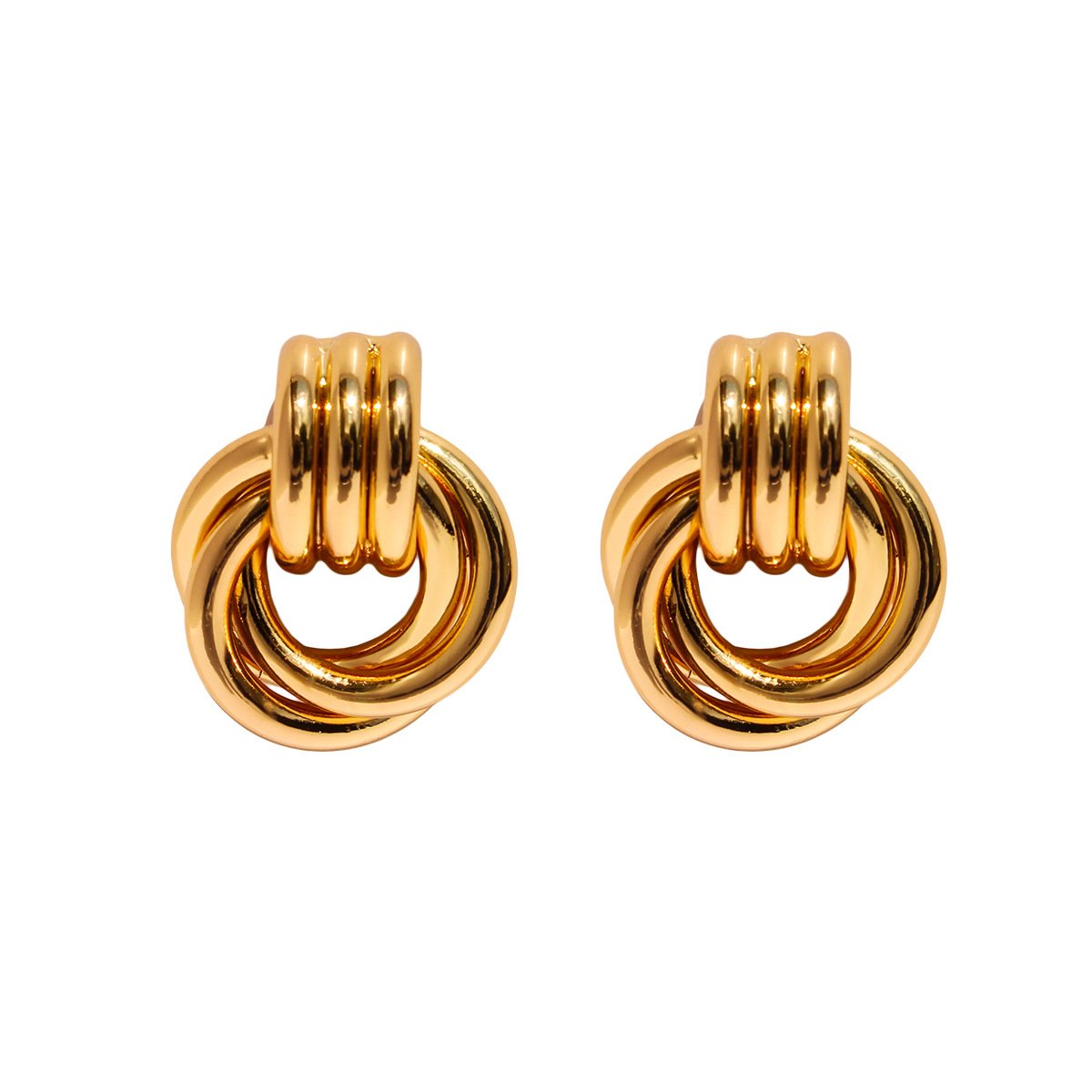 Elevate your inventory with our Wholesale Bold Earrings. These exquisite new earrings feature a unique and creative double-ring chain wrapping around a circular knot, showcasing fashionable lines and a geometric design. Crafted from high-quality copper with a smooth, stone-free finish, they offer two plating options: luxurious 18K gold and sleek platinum. This niche, personalized, and exaggerated design is perfect for women who love bold and distinctive accessories. At junejewelry.com, we provide original, unique products. Our factory-direct pricing ensures excellent value. It is also cheap. We guarantee high quality. Enjoy free shipping. Attract more traffic. Significantly boost sales on your independent fashion jewelry wholesale website.