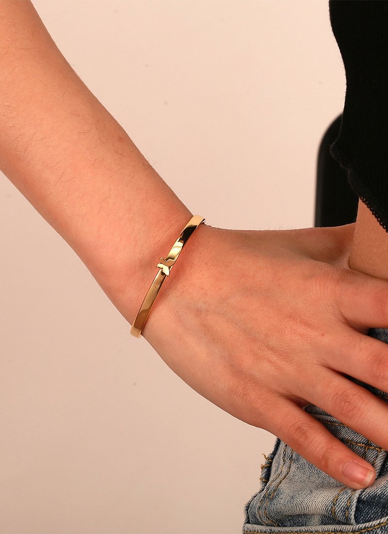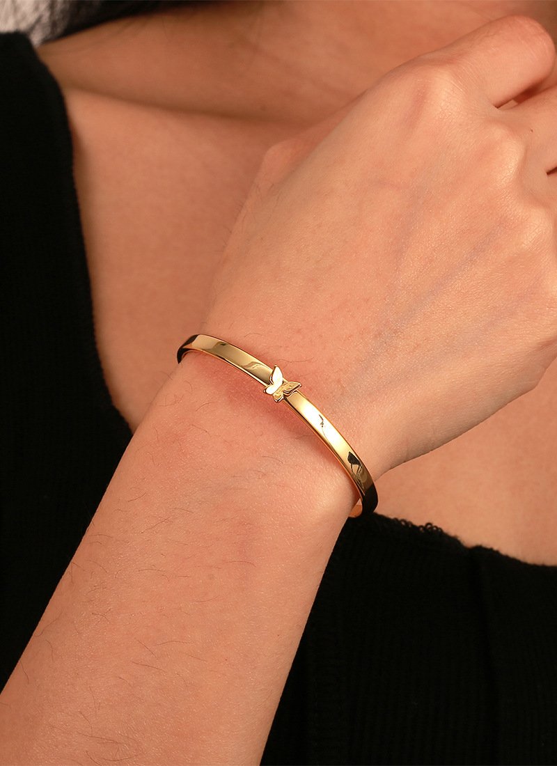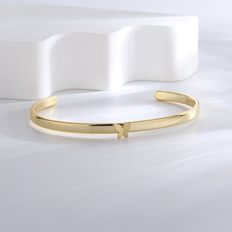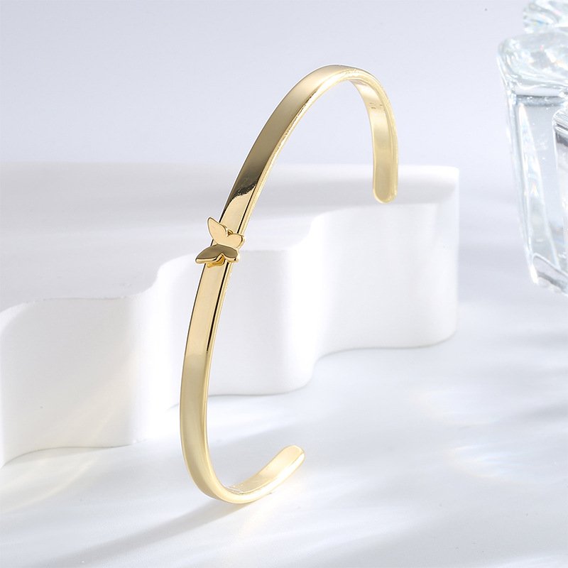 Discover our wholesale butterfly cuff bracelet. This minimalist, European-style open cuff design, crafted from 14K gold plated copper, features a delicate butterfly design. This chic and adjustable bracelet adds a touch of delicate elegance to any outfit.