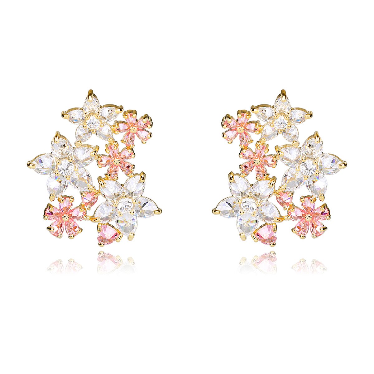 Wholesale Colorful Flower Stud Earrings with a gold plated finish and ruby-colored and clear cubic zirconia stones from JuneJewelry.com – unique fashion jewelry for bulk orders.