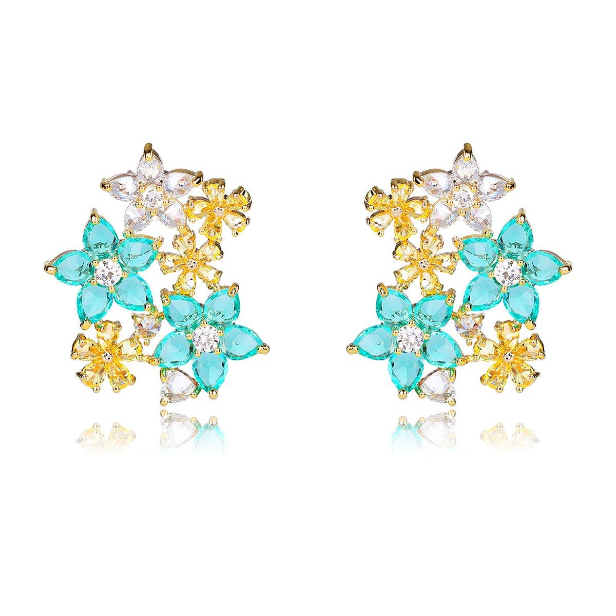 Wholesale Colorful Flower Stud Earrings with a gold plated finish and emerald-colored and clear cubic zirconia stones from JuneJewelry.com – unique fashion jewelry for bulk orders.