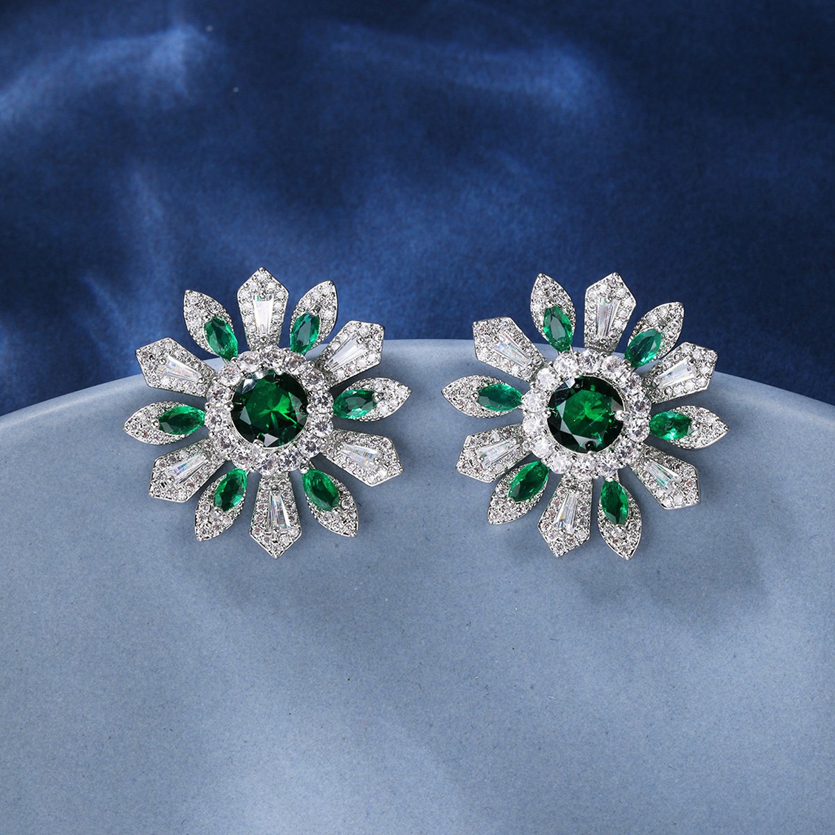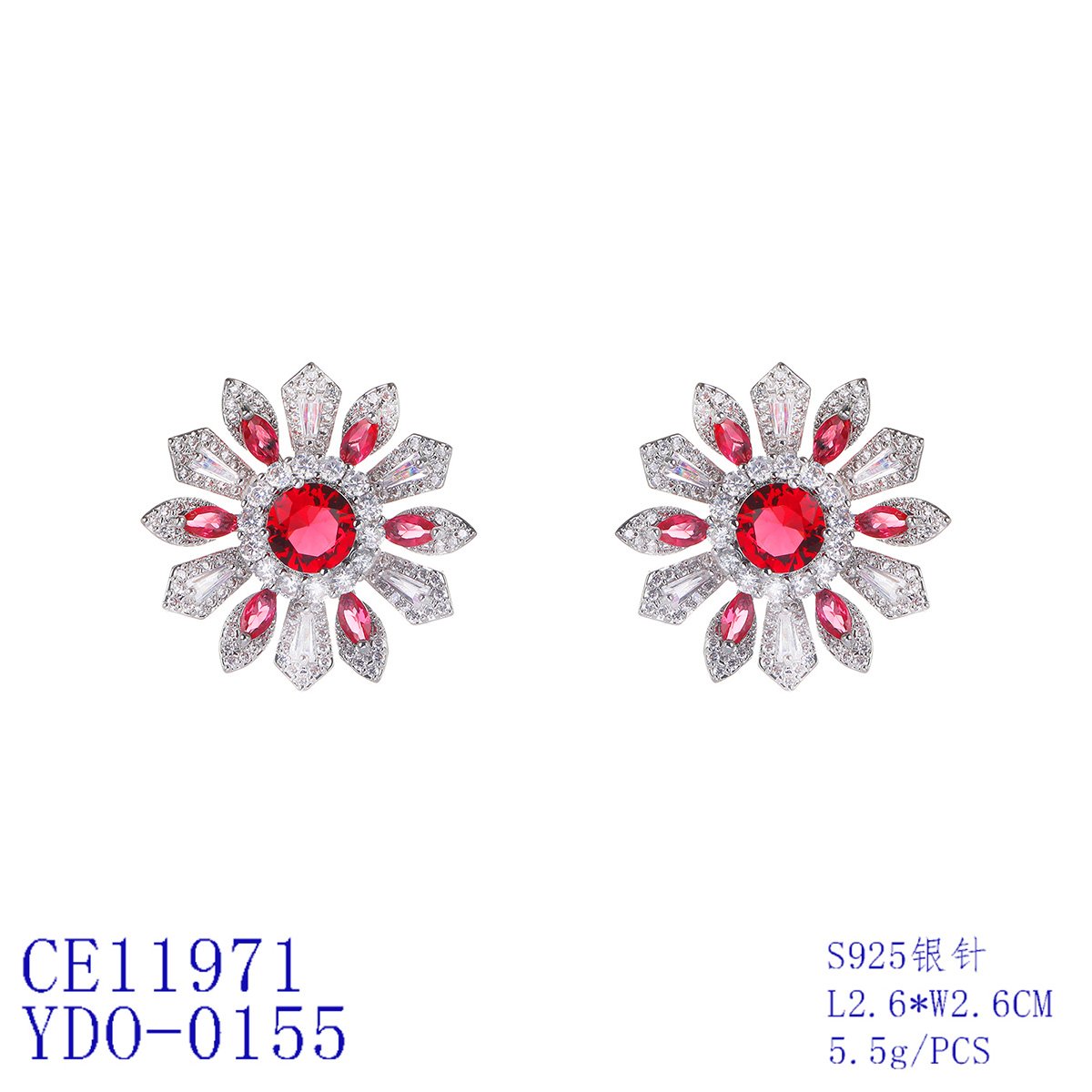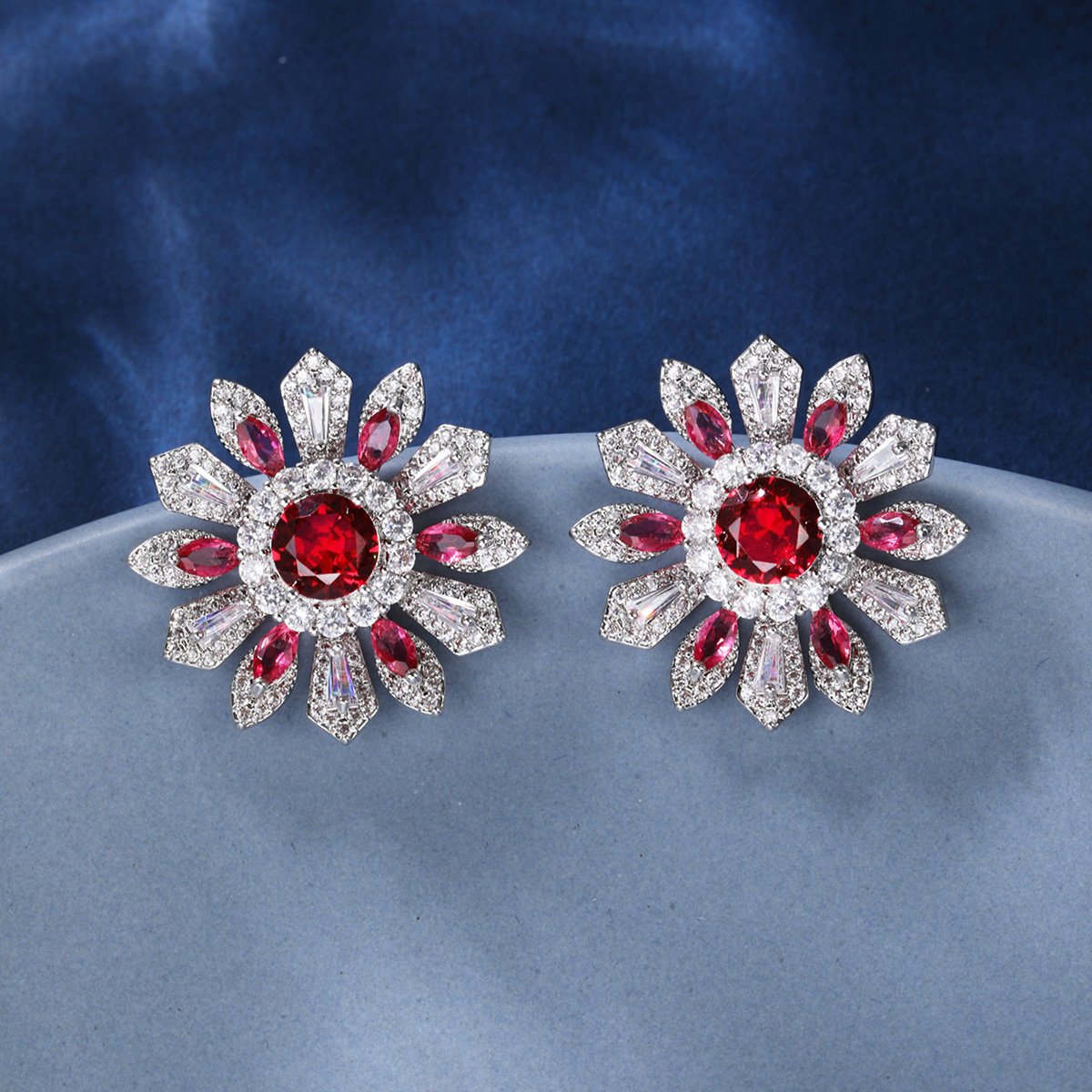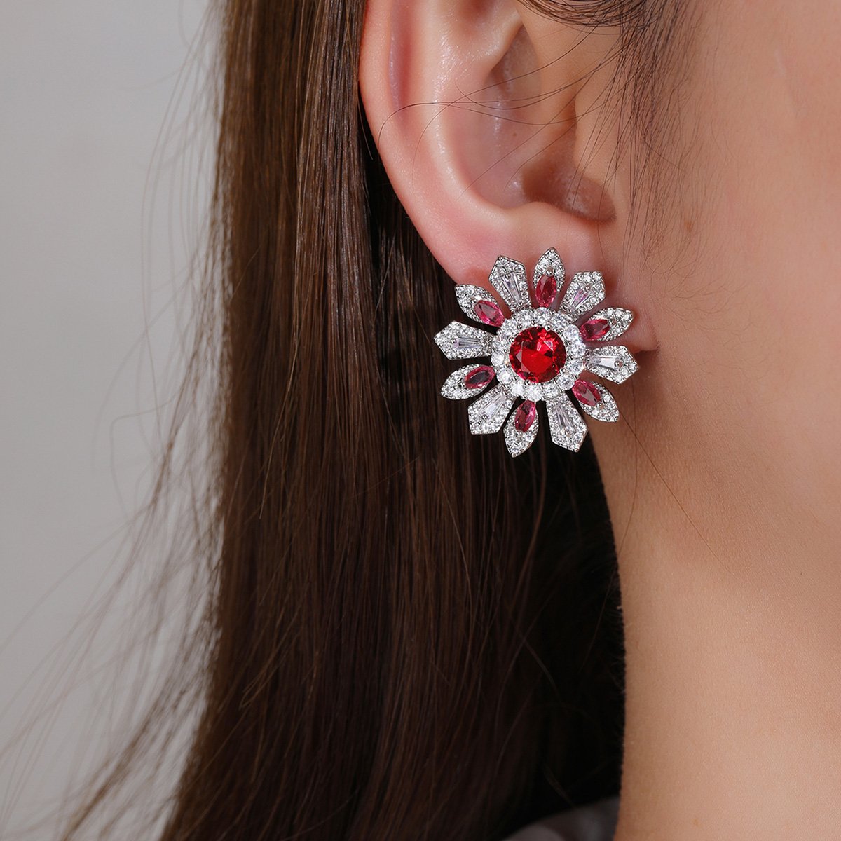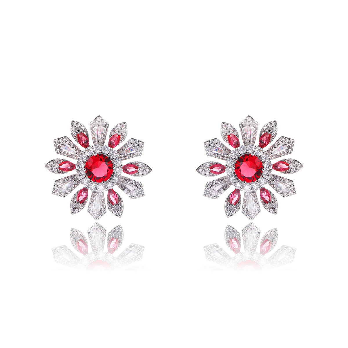 Brighten your inventory with our Wholesale Colorful Flower Stud Earrings. These striking earrings feature a vibrant flower design. They are adorned with brilliant ruby-red and clear cubic zirconia stones. We craft them with a durable copper base and secure 925 silver posts. They are perfect for customers seeking unique, nature-inspired accessories.