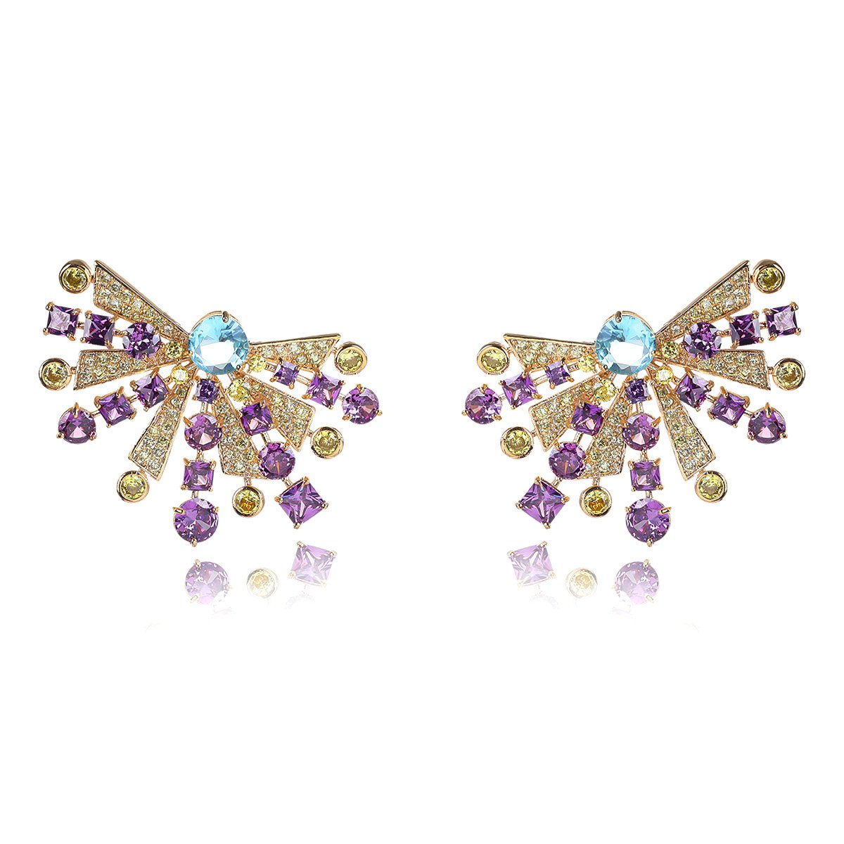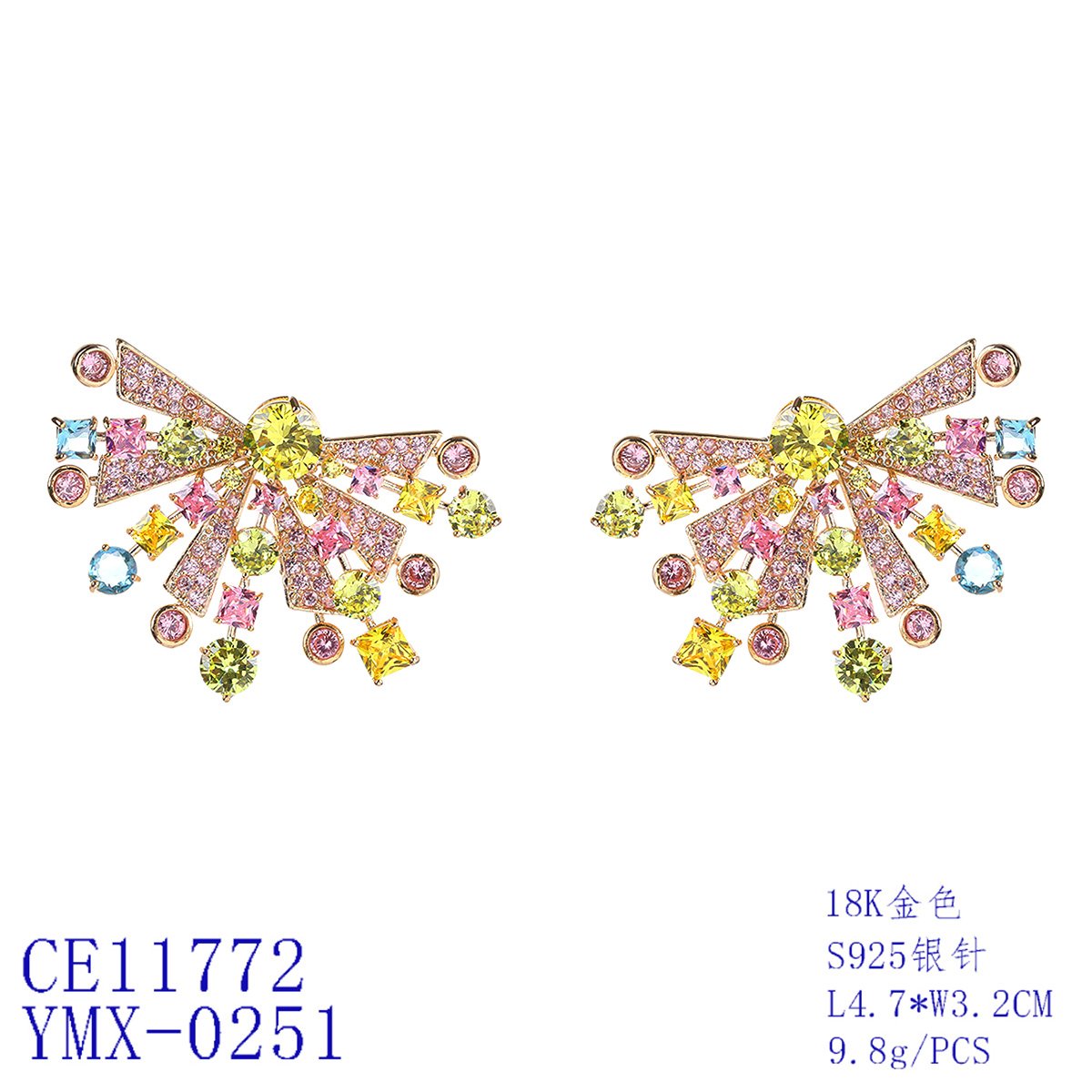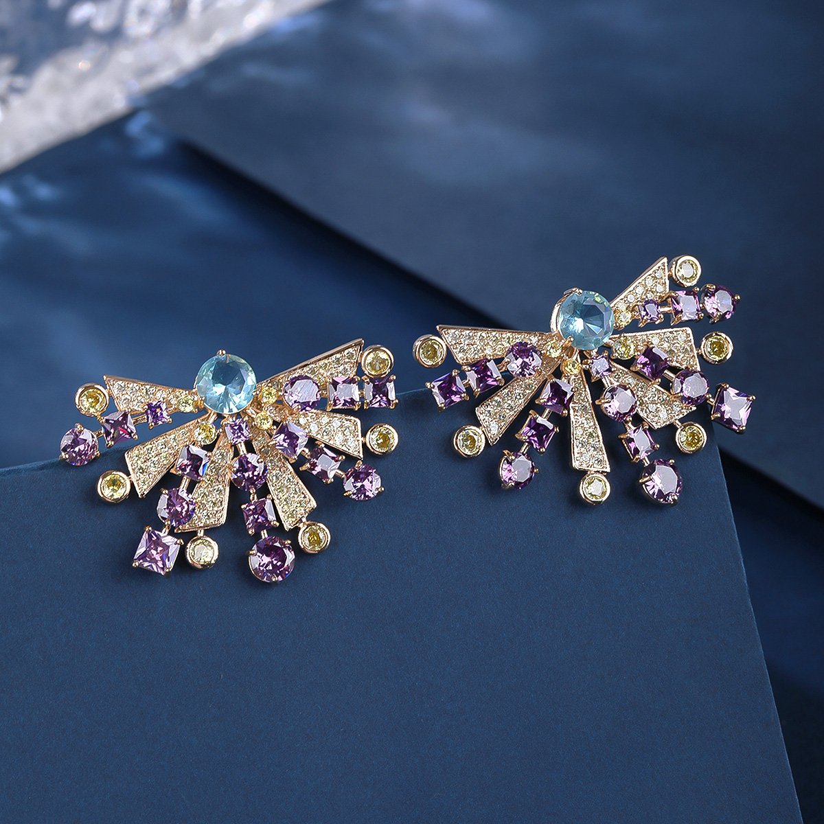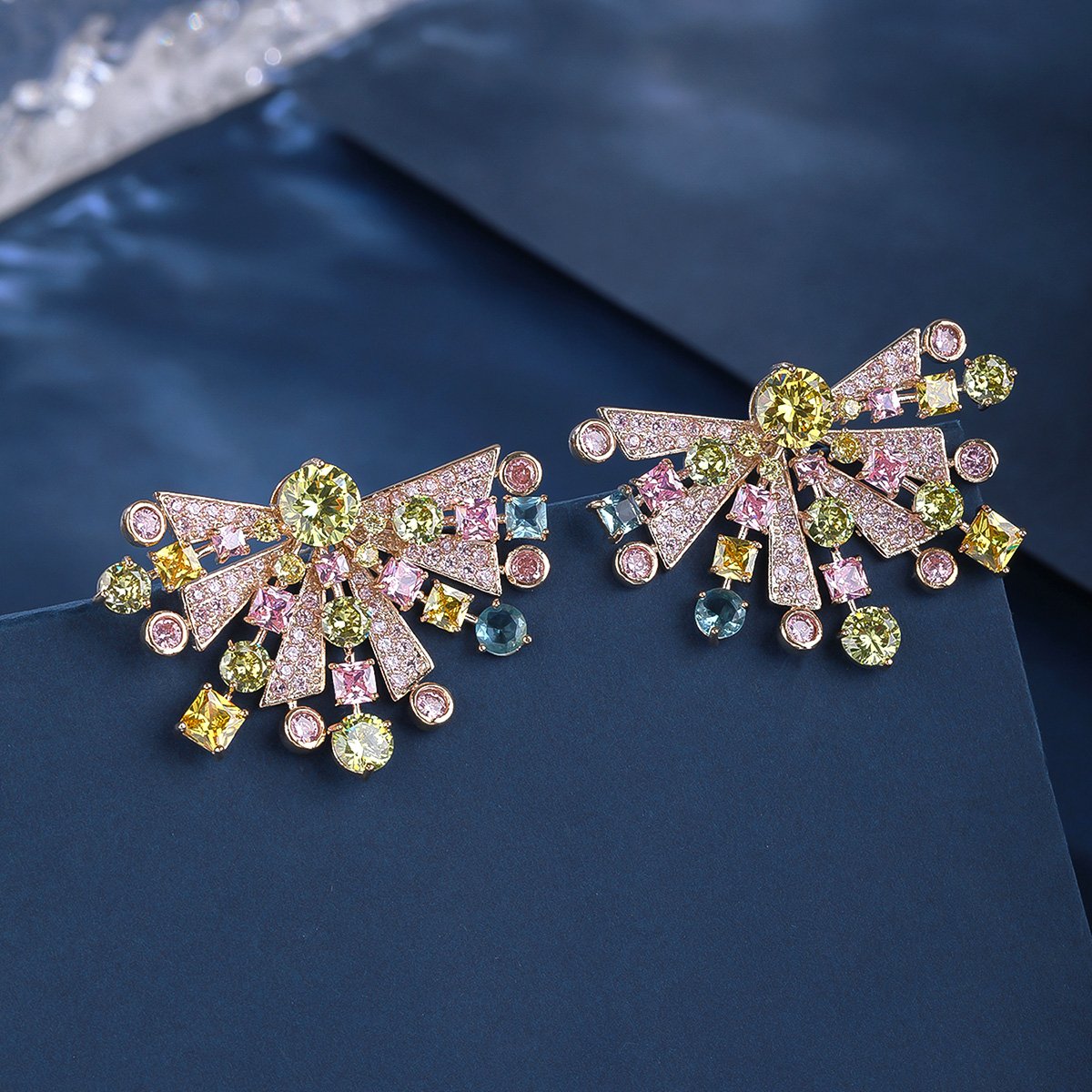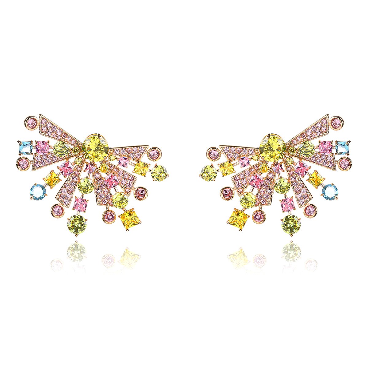 Brighten up your inventory with our Wholesale Colorful Gemstone Earrings. This striking and unique design is a must-have for any fashion jewelry collection. Each earring features a stunning display of multi-colored zircons. The design radiates outwards like a sunburst or a stylized butterfly wing. The colorful stones include shades of pink, yellow, blue, and green, creating a vibrant and cheerful look.