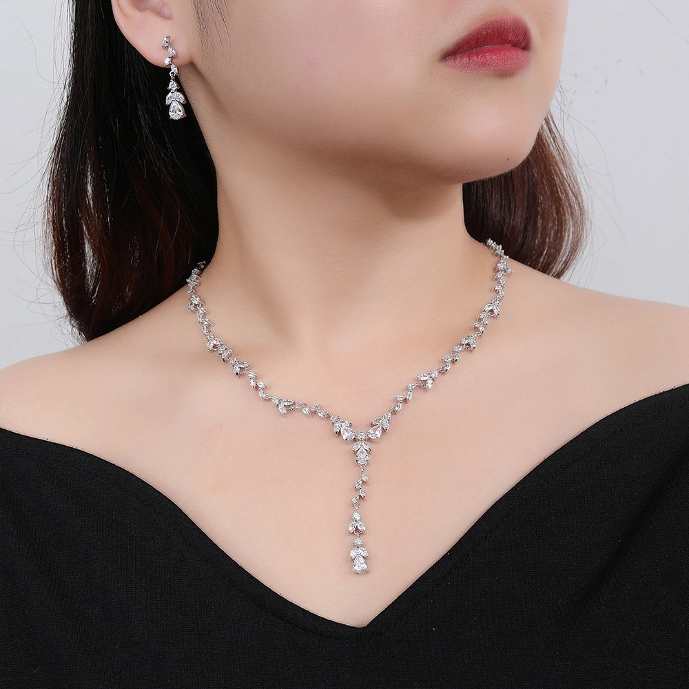 Stand out in the competitive fashion market with our original and unique jewelry silhouettes. This Wholesale Copper Zircon Jewelry Set showcases intricate vine and leaf patterns for a nature-inspired look. Our design team focuses on creating eye-catching sets that retail customers cannot find elsewhere. The delicate craftsmanship makes these pieces ideal for weddings, galas, and formal evening events. Each marquise-cut zircon is meticulously set to capture light from every possible angle. These sets offer a sophisticated aesthetic that complements both classic and contemporary bridal gowns. We help you build a distinctive brand identity by providing exclusive and fashionable stock. You can easily diversify your product range with these versatile and elegant designs.