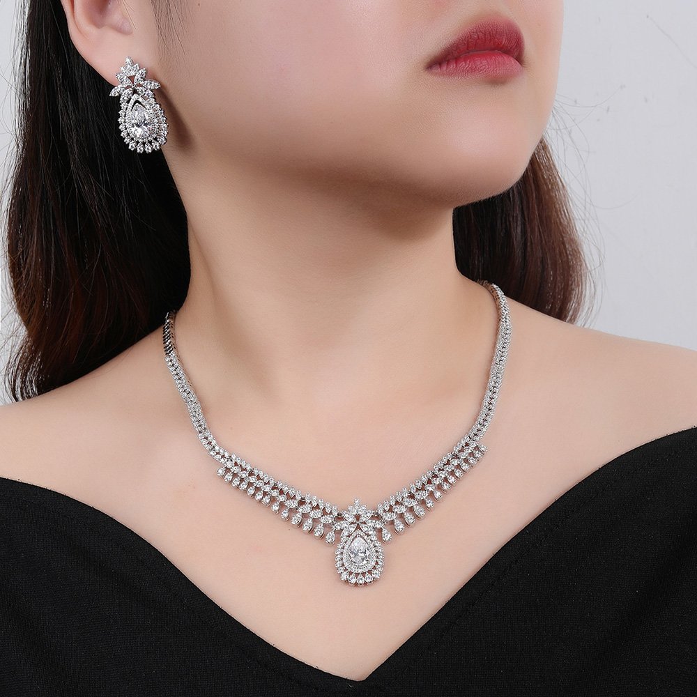 Our creative team develops original and unique styles to help your brand stand out. This Wholesale Copper Zircon Set offers a sophisticated aesthetic for formal occasions. We focus on intricate detailing that blends classic elegance with modern trends. The necklace and earring combination provides a complete and cohesive look. Our artisans hand-set each zircon stone to ensure perfect alignment and security. This set complements bridal gowns and elegant evening dresses perfectly. You can provide your clients with exclusive designs not found elsewhere. We aim to help you build a distinctive jewelry brand identity. Diversify your offerings with these timeless and versatile jewelry pieces.