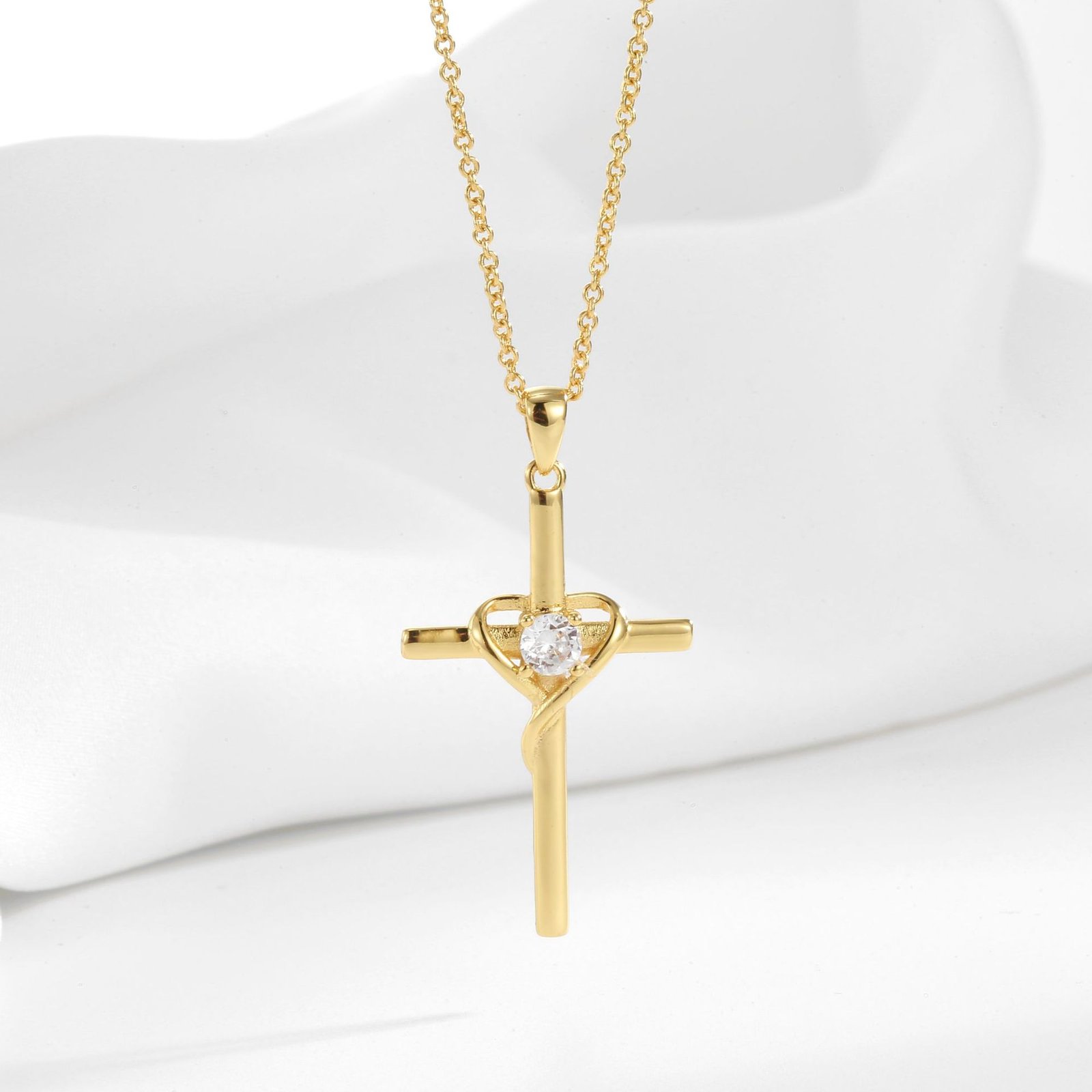Wholesale cross heart pendant necklace with cubic zirconia in 18K gold plated brass – street style jewelry from JuneJewelry.com.