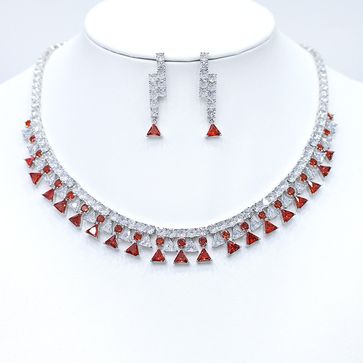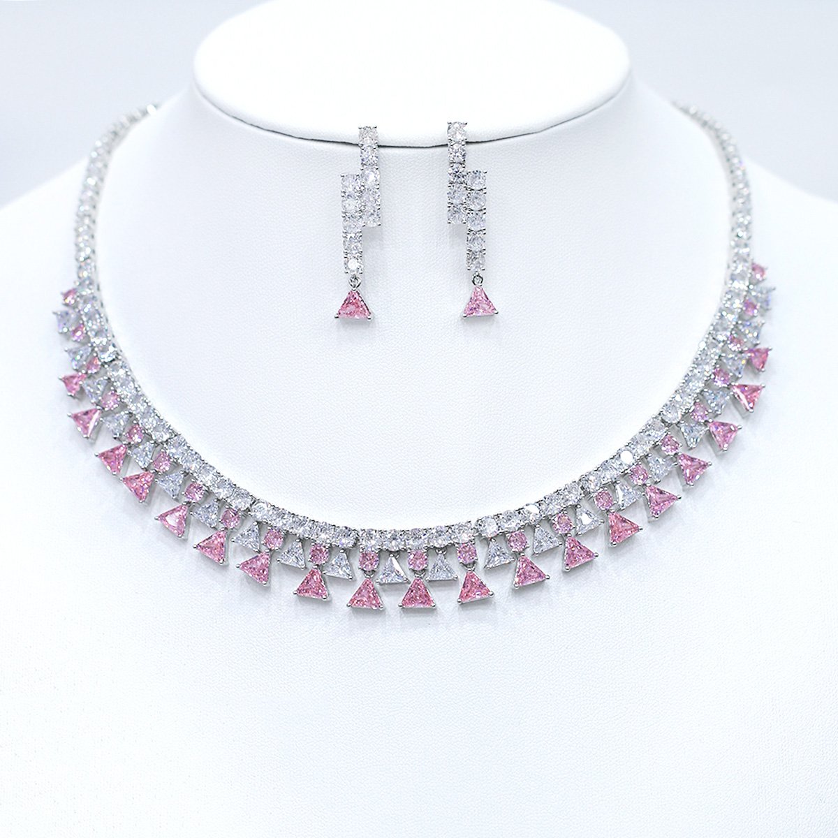 Enhance your jewelry inventory with this stunning wholesale cubic zirconia set. The exquisite collection includes a beautiful necklace and matching earrings. Each piece is crafted from durable brass. They are then finished with a high-quality platinum plating. The design features an array of brilliant cubic zirconia stones. These stones are meticulously cut and arranged. The necklace has a unique, striking design. It showcases a double row of dazzling stones. Smaller, intricate shapes dangle from the bottom row. The earrings are sleek and elegant drops. They perfectly complement the necklace. This set is perfect for formal occasions. It is a great choice for bridal wear. The glamorous look will attract many customers.