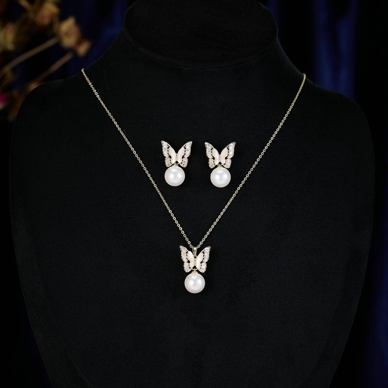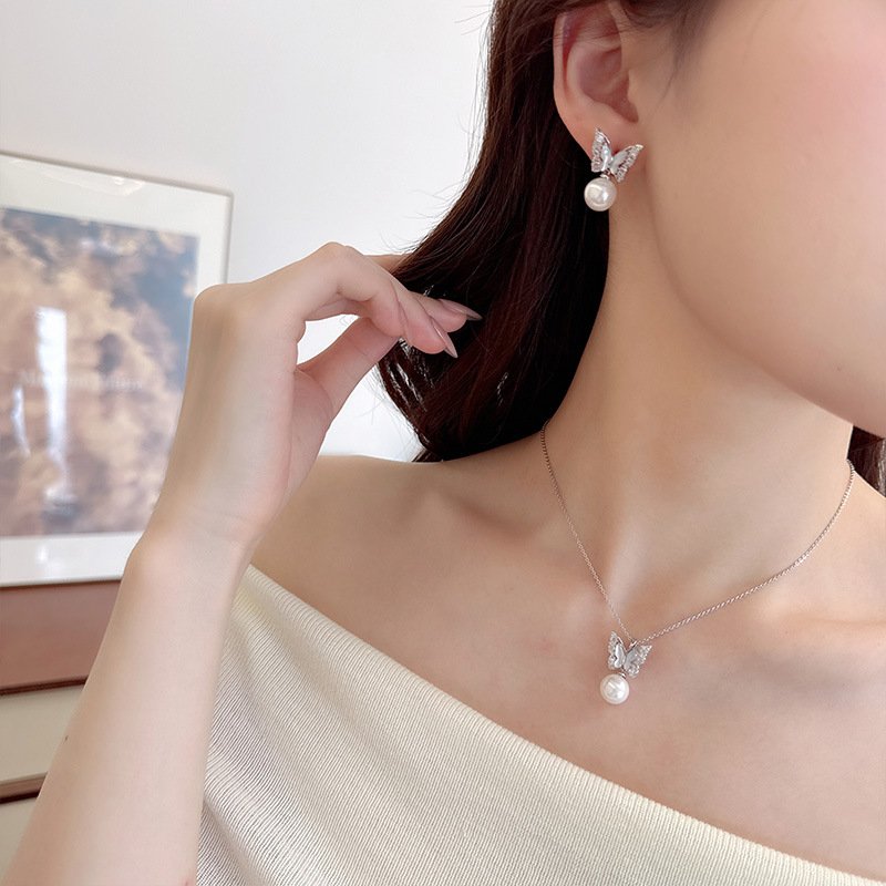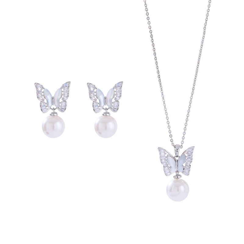 - Pendant Necklace: The CZ butterfly and pearl drop pendant hang from a delicate, matching chain with an adjustable clasp.