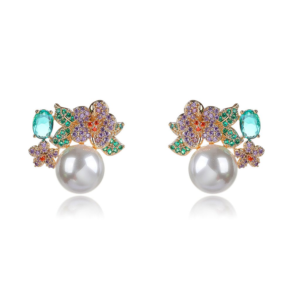 These Wholesale Floral Pearl Earrings showcase a breathtaking array of multicolored cubic zirconia crystals in floral patterns. Our artisans hand-set every stone to ensure maximum sparkle and precision. A large, high-luster shell pearl sits elegantly at the base of the design. This combination creates a sophisticated focal point for any formal or casual outfit.