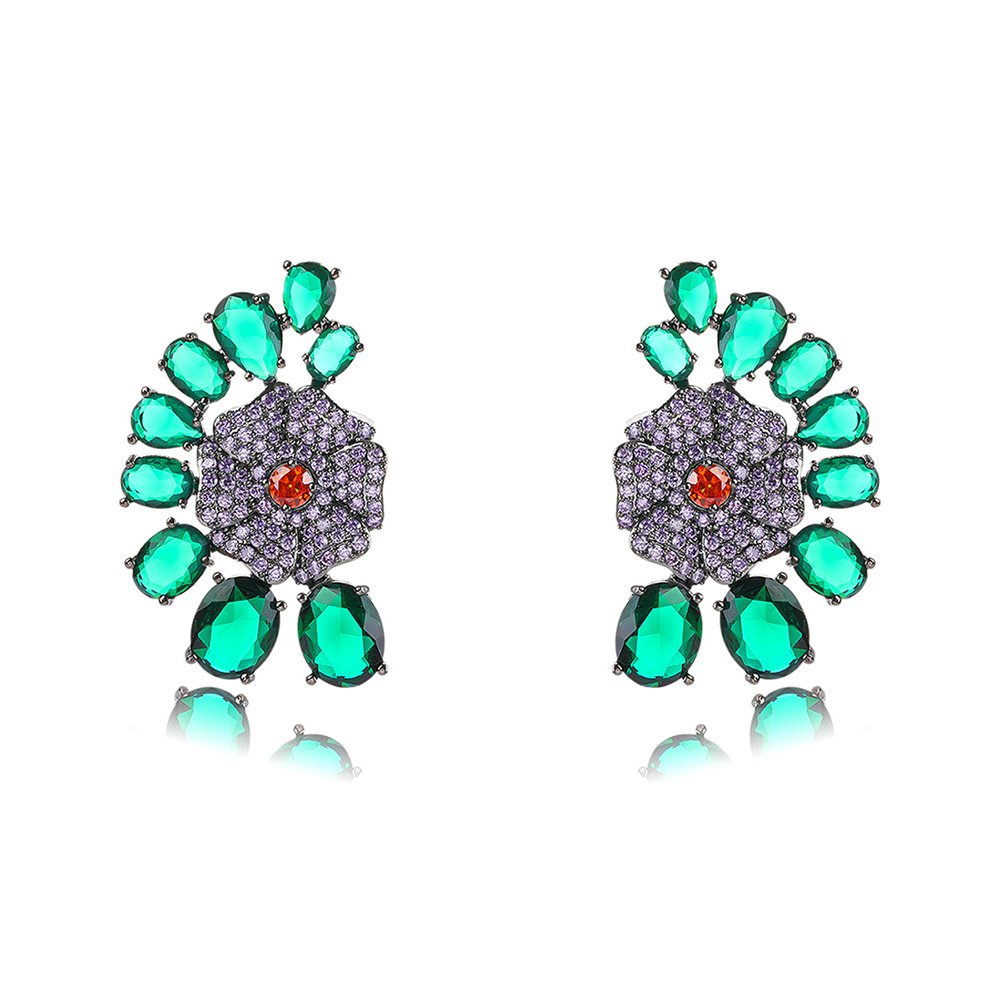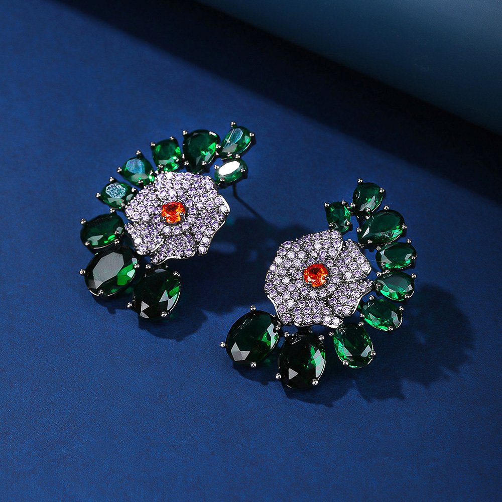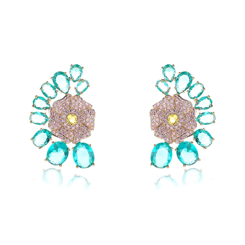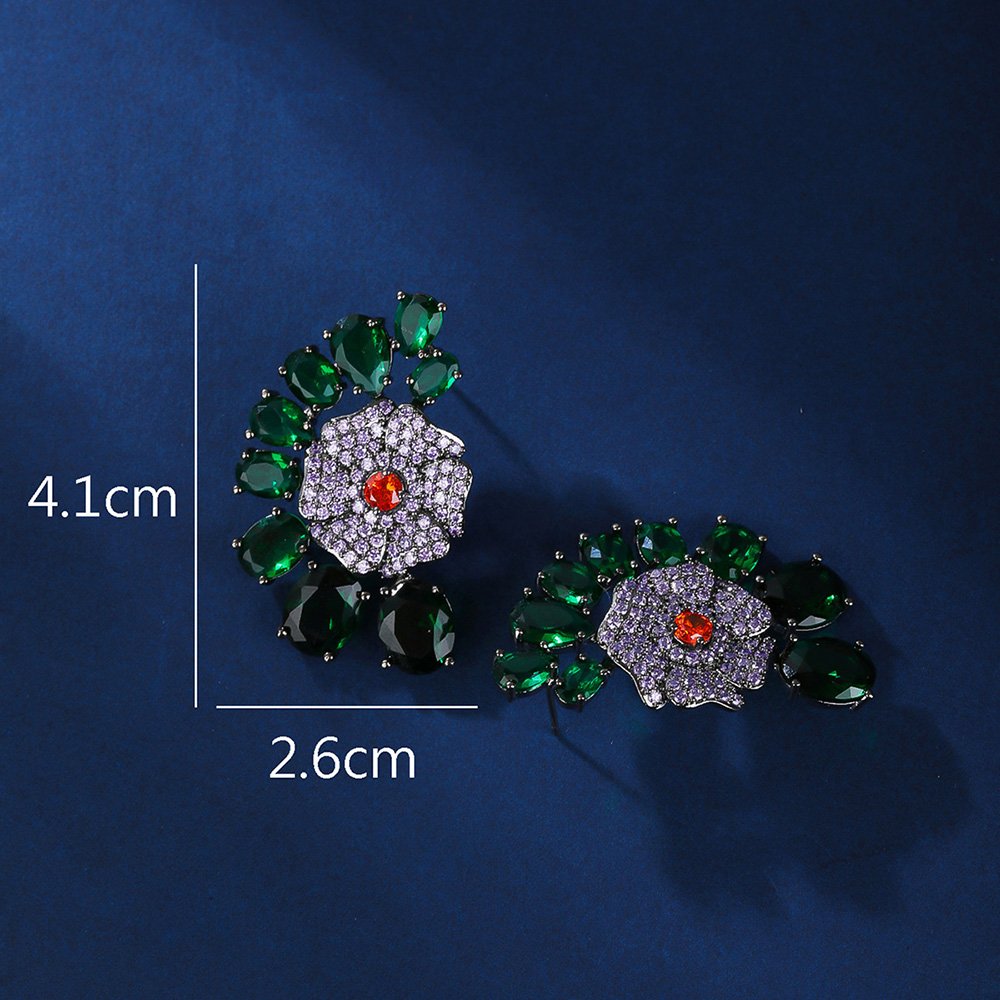 Elevate your accessory offerings with our Wholesale Floral Zircon Earrings—we have masterfully blended botanical elegance with premium jewelry craftsmanship. This vibrant design features a central micro-pavé flower surrounded by a fan of colorful, high-grade zircon stones. We use a high-quality copper base and finish it with real gold plating for a luxurious, lasting shine. To ensure maximum comfort for your customers, we specifically use 925 silver pins for every pair.