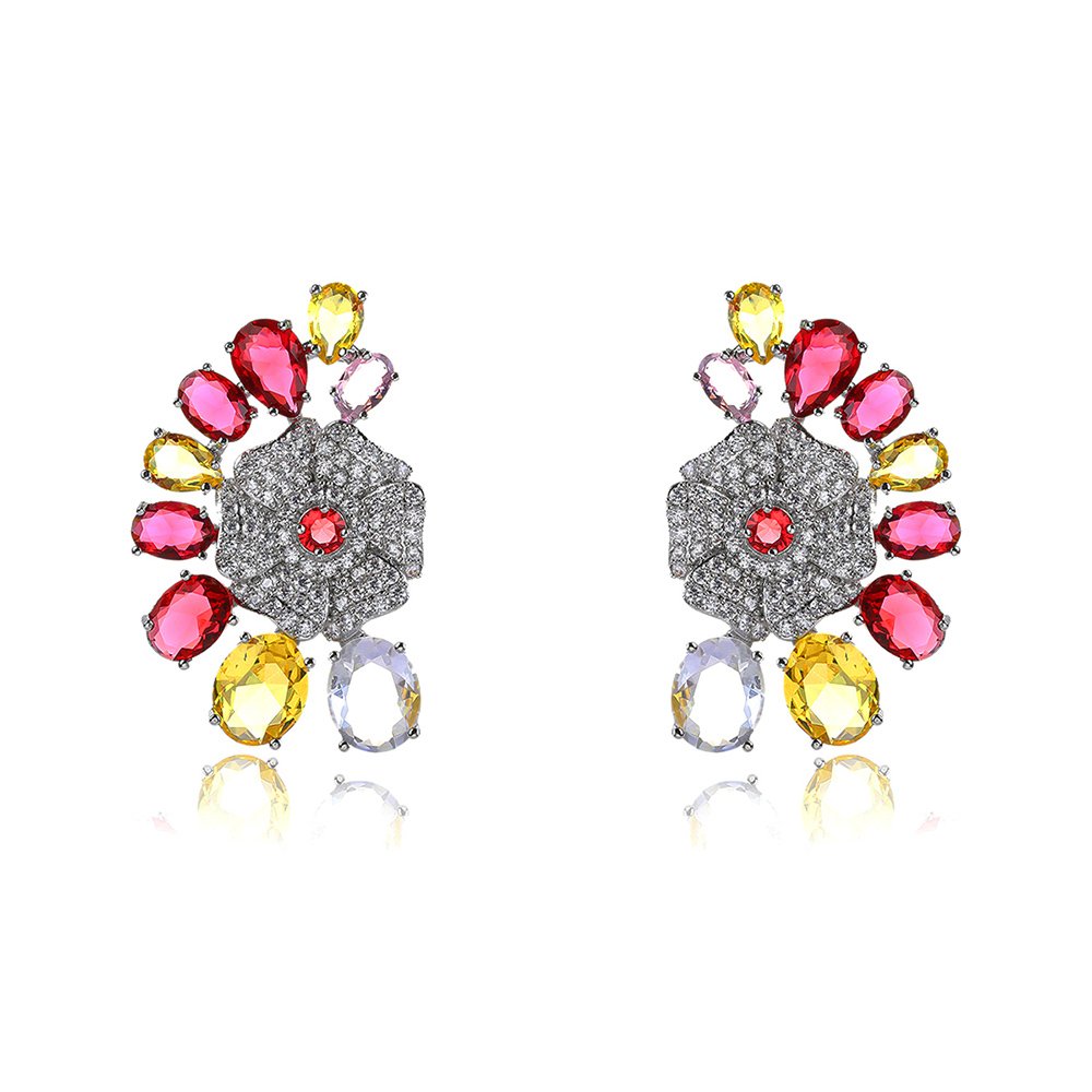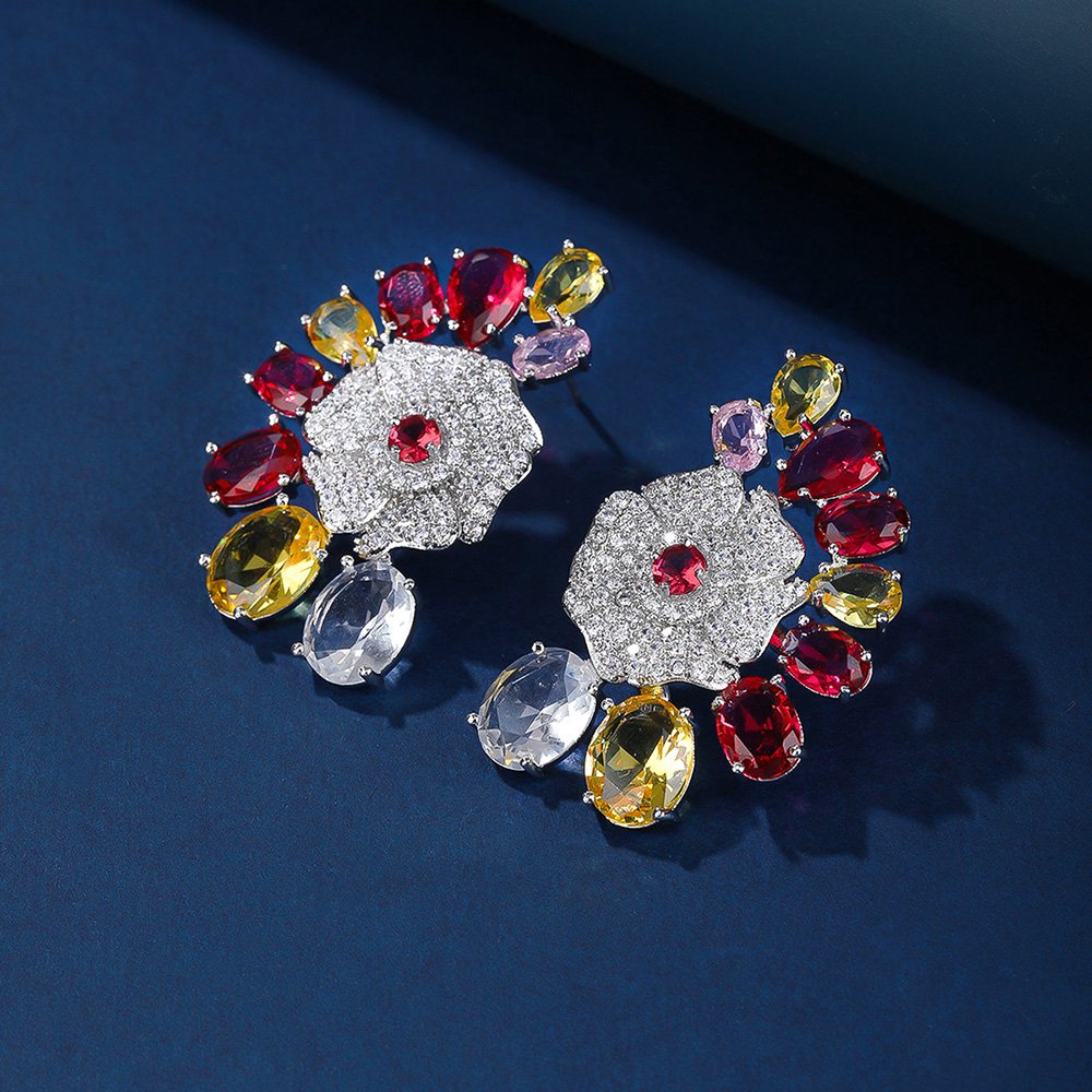 Our designers created these Wholesale Floral Zircon Earrings with a bold, multi-color palette that includes ruby red and sunshine yellow. These statement pieces are perfect for fashion boutiques, wedding suppliers, and professional eCommerce sellers looking for unique inventory. We craft each earring to catch the light beautifully, making them ideal for festive occasions and elegant parties. The intricate pavé work reflects our commitment to high-quality manufacturing and original jewelry design.