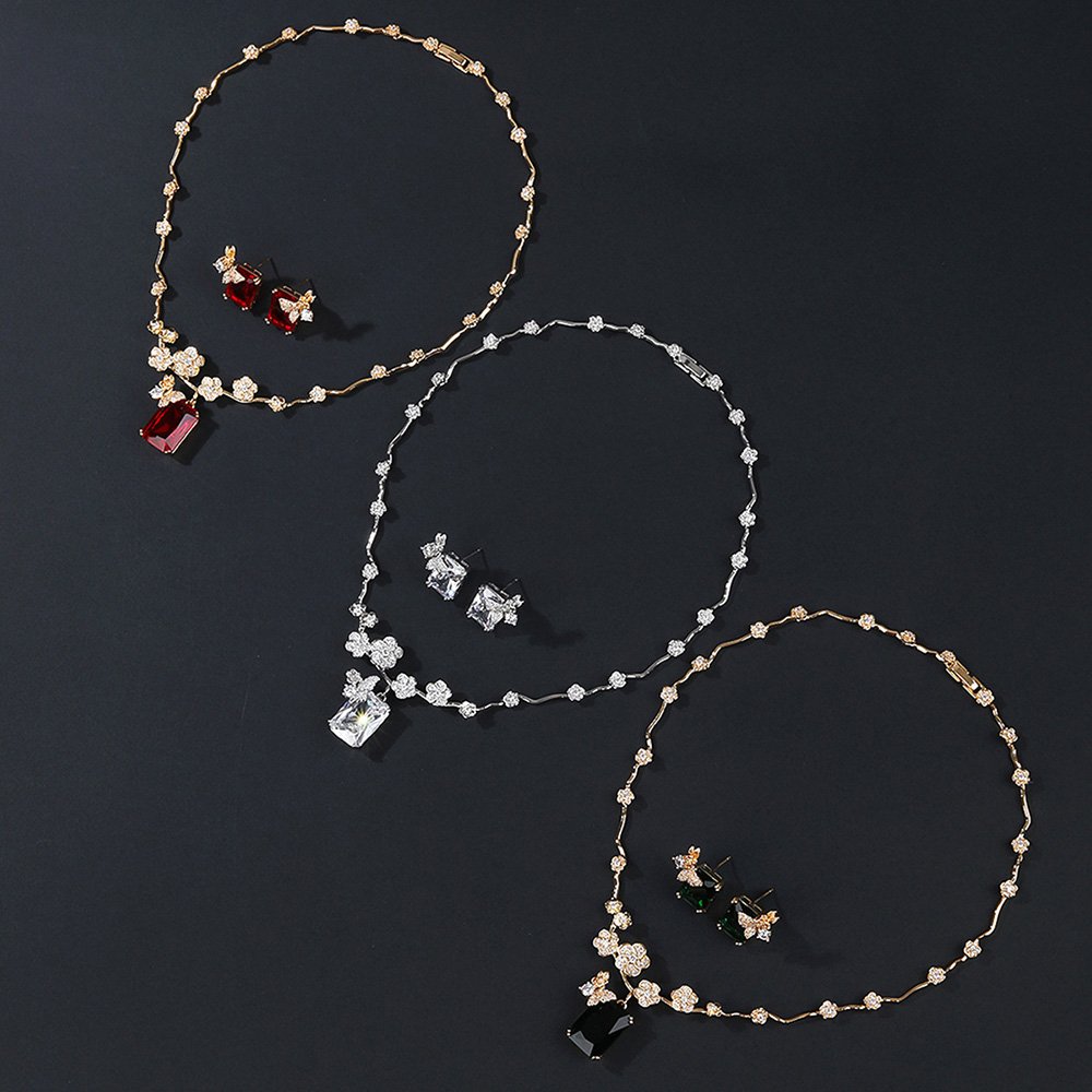 We offer free shipping on all orders to make your international sourcing process more convenient and highly cost-effective. The intricate floral patterns surrounding the emerald-cut zircons provide a sophisticated look that pairs perfectly with modern evening wear. Our Wholesale Floral Zircon Set represents the ideal combination of factory-direct value and high-end boutique appeal for jewelry sellers.