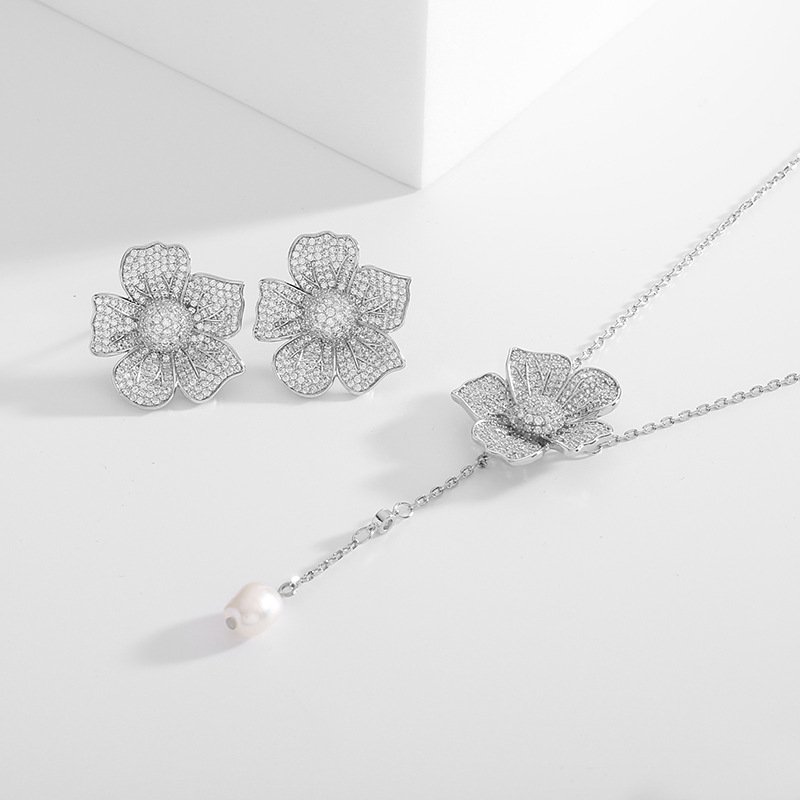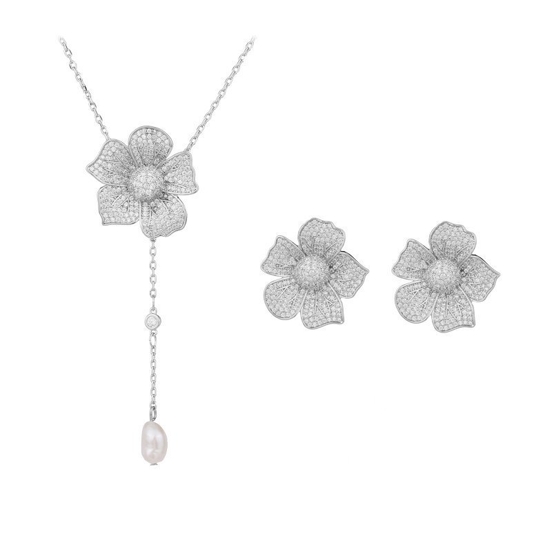 Wholesale Flower Pearl Jewelry Set – White Gold Plated Brass