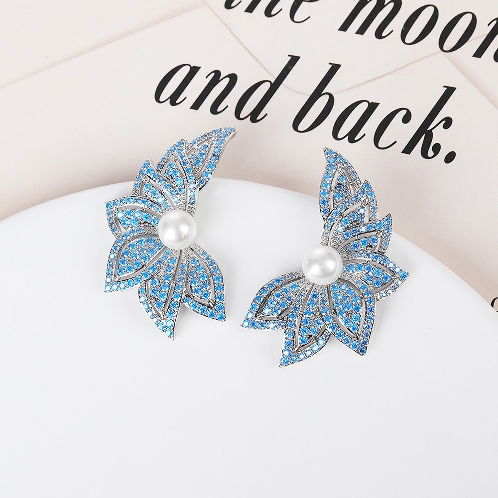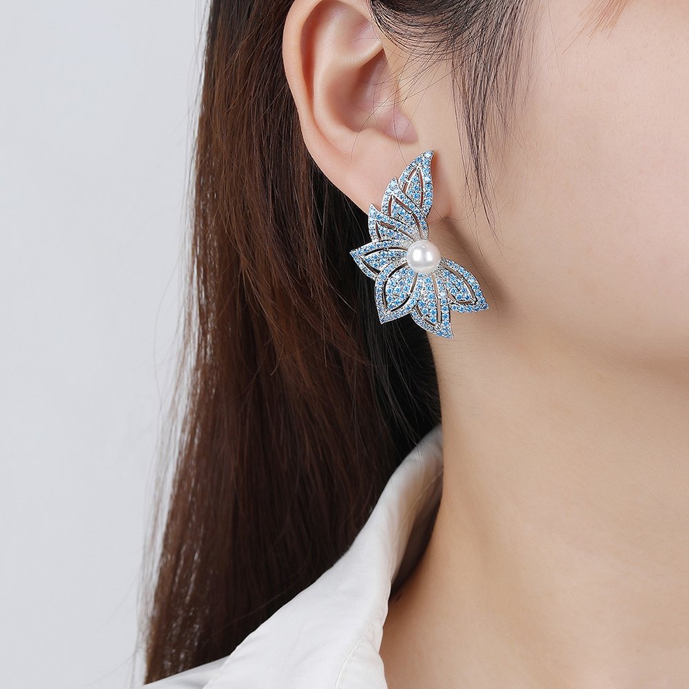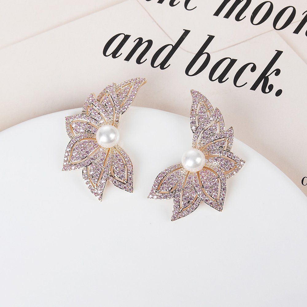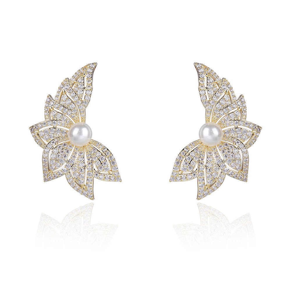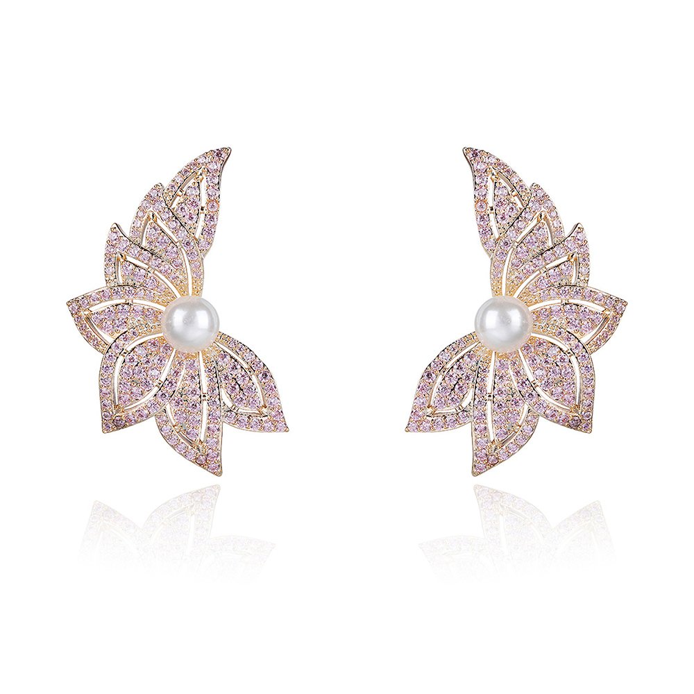 Wholesale Flowers Pearl Earrings provide a high-end look that will surely captivate your fashion-forward customers. We designed these unique wing-shaped floral earrings to combine natural beauty with modern sophistication. Our team uses a sturdy copper base for durability and applies a thick real gold plating for a luxurious finish. Each earring features a lustrous shell pearl center surrounded by brilliant zircon stones that sparkle from every angle.
