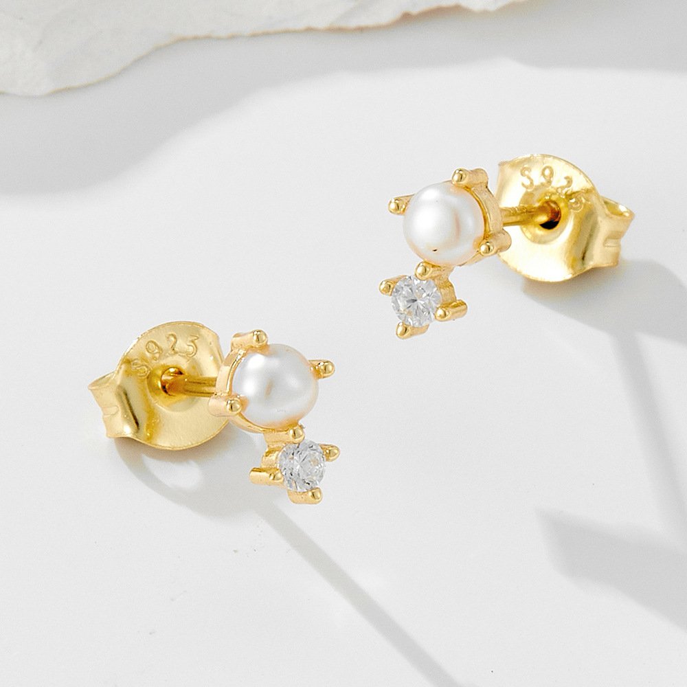 Elevate your inventory with our Wholesale freshwater Pearl Studs. These exquisite new earrings feature natural pearls. They are elegantly complemented by sparkling diamond inlays. Crafted from genuine S925 sterling silver, they are plated with 18K gold. This European-style jewelry embodies light luxury. It offers a simple, personalized, and fashionable aesthetic. It is also small and perfect as an ear bone stud or general earring. At junejewelry.com, we provide original, unique products. Our factory-direct pricing ensures excellent value. It is also cheap. We guarantee high quality. Enjoy free shipping. Attract more traffic. Significantly boost sales on your independent fashion jewelry wholesale website.