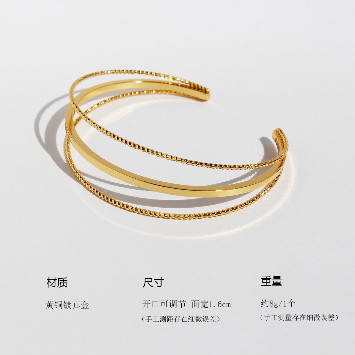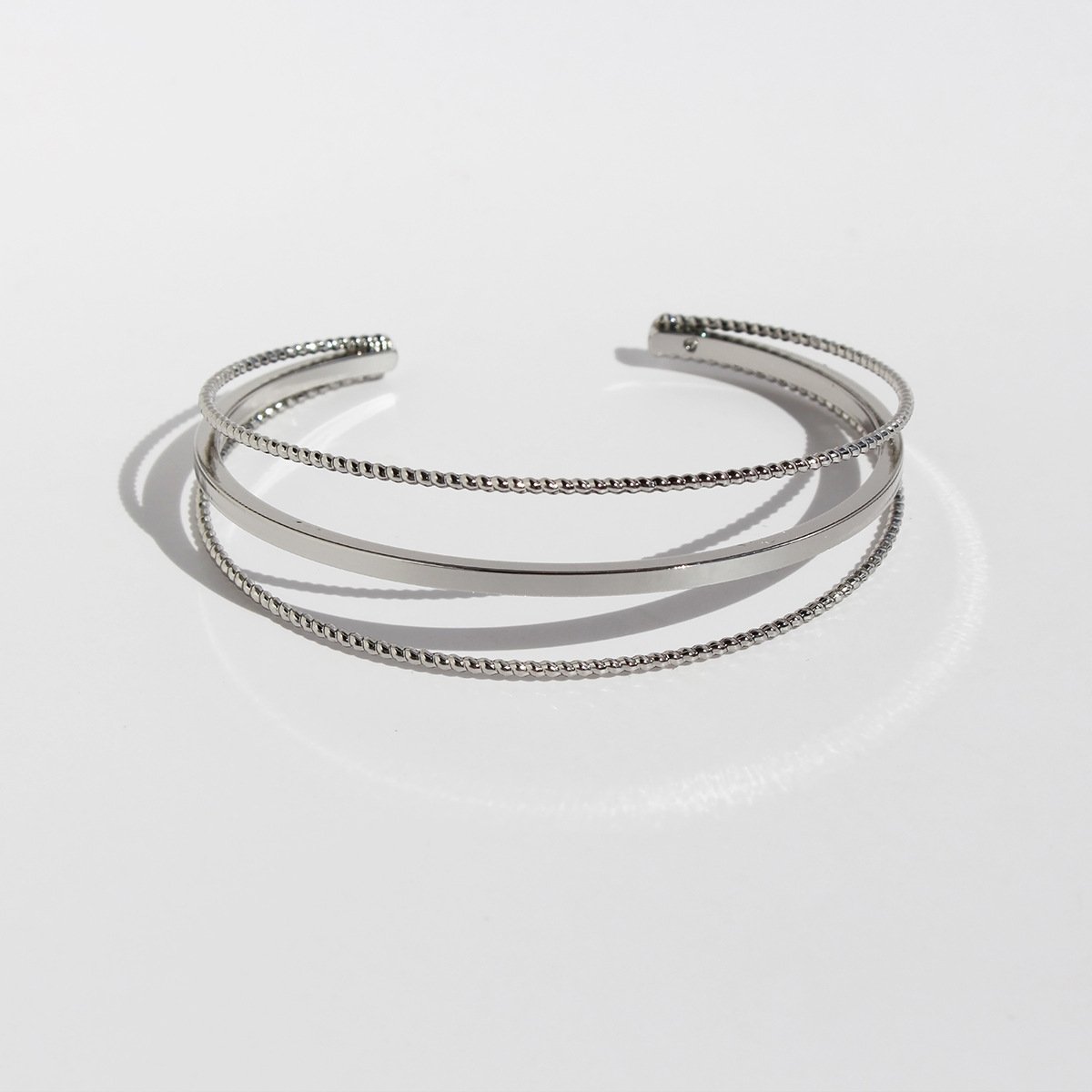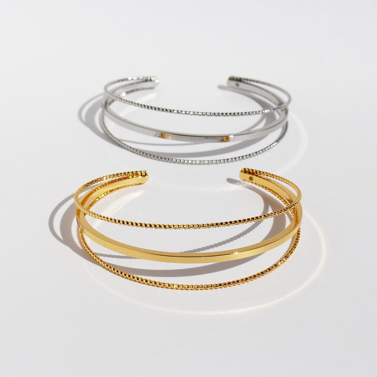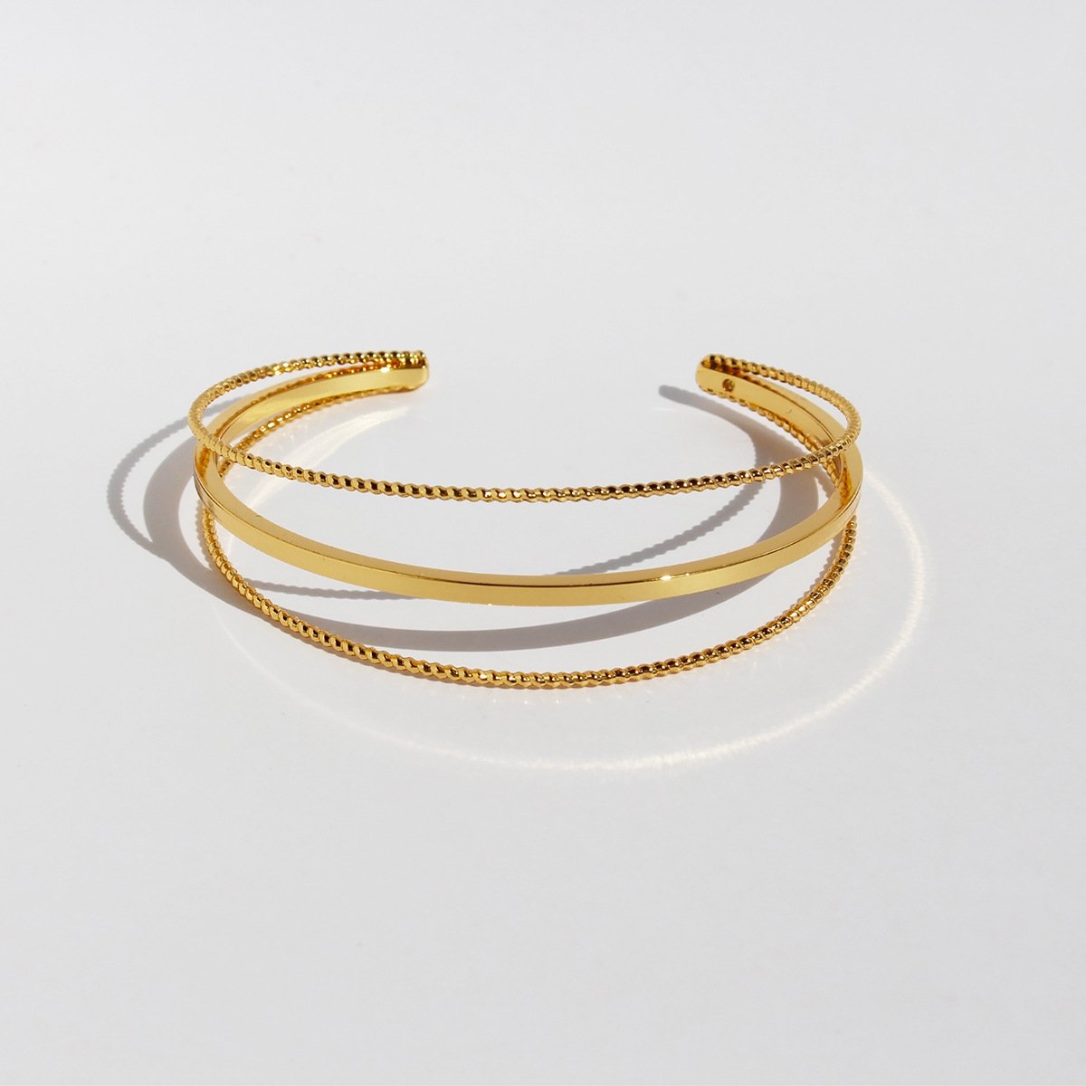 Discover modern elegance with our Wholesale Geometric Cuff Bracelet, featuring a sleek 3-layer twisted design with a faceted rope texture. This minimalist open bangle showcases fine craftsmanship in high-quality brass, available in both 18K gold and platinum electroplating. Its clean geometric lines and multidimensional structure add a refined yet edgy statement to any look, making it a best-seller for fashion retailers, online boutiques, and international jewelry wholesalers. A perfect addition to curated collections aiming for lightweight luxury and trendy appeal. Enjoy factory prices and free global shipping exclusively on JuneJewelry.com.