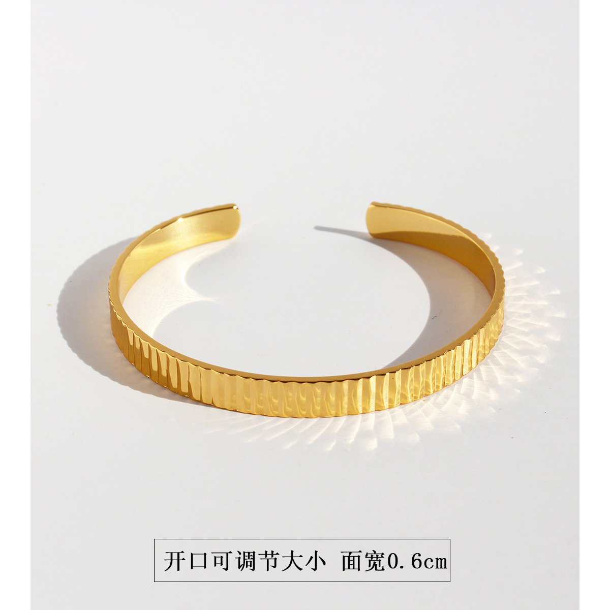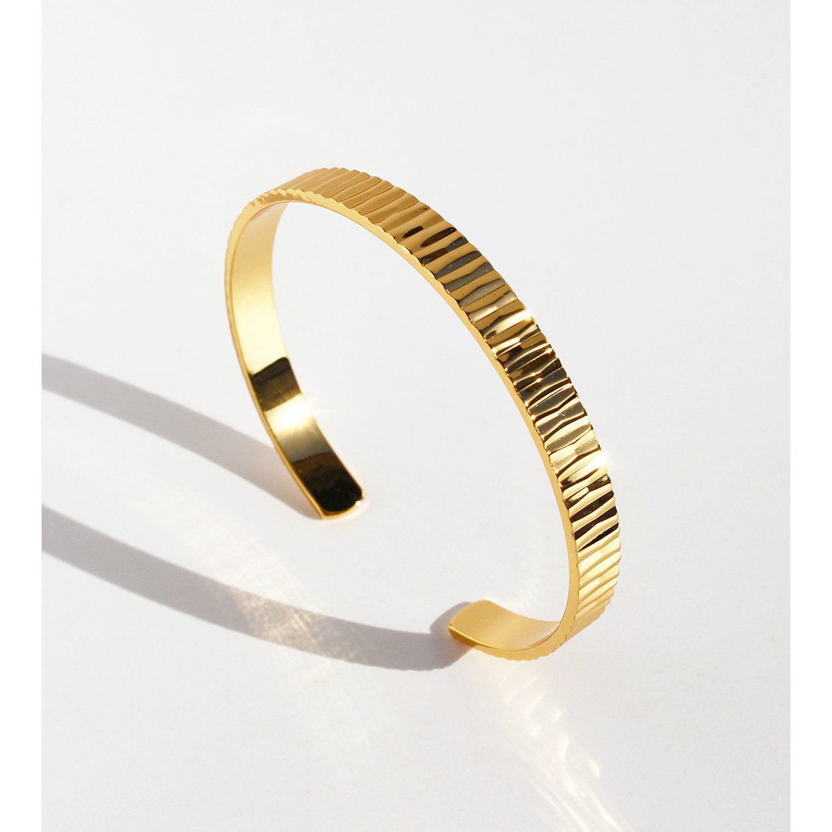 Discover understated elegance with our Wholesale Gold Cuff Bracelet, a minimalist yet striking accessory crafted for fashion-forward retailers and cross-border jewelry resellers. Featuring a bold vertical stripe (dog tooth) texture and open-ended design, this high-quality bangle is made of durable brass and luxuriously plated in 18K real gold. Its clean lines and high-end designer feel make it ideal for boutiques seeking elevated essentials that resonate with modern, luxury-minded customers. Lightweight, comfortable, and versatile—perfect for layering or standalone wear. Get factory-direct pricing and free worldwide shipping from JuneJewelry.com, your trusted source for premium wholesale jewelry.