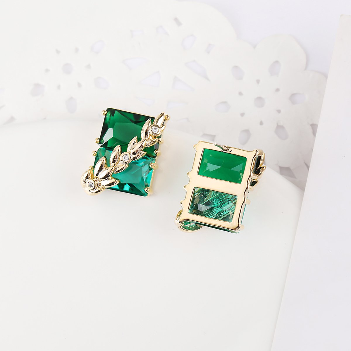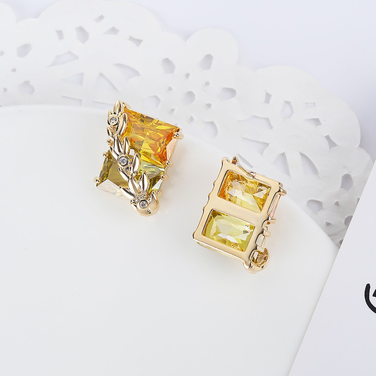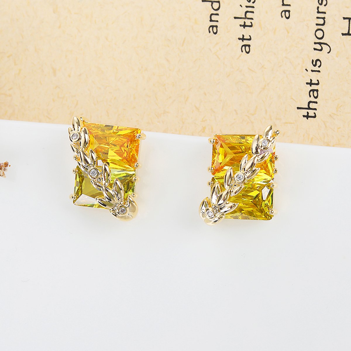 Wholesale gold leaf earrings with two-toned yellow rectangular CZ stones from junejewelry.com – unique fashion jewelry for bulk orders.