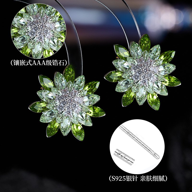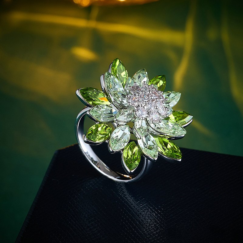 Introduce a fresh, vibrant aesthetic to your inventory with our gorgeous new Wholesale Flower Ring & Earrings set. This captivating jewelry ensemble features a stunning, large floral motif, meticulously crafted using brilliant Peridot and light green Marquise Cut crystals/zircons that graduate in color from the sparkling white center outwards. The set includes a matching Statement Ring and Stud Earrings, ideal for Cocktail Parties, weddings, and fashion events. Finished with a high-quality 18K White Gold Plated layer over durable Copper, this collection offers a Light Luxury look at an unbeatable price. At JuneJewelry.com, we provide High Quality and competitive Factory Price options, ensuring your wholesale purchase of this unique, high-turnover item comes with the added benefit of Free Shipping.