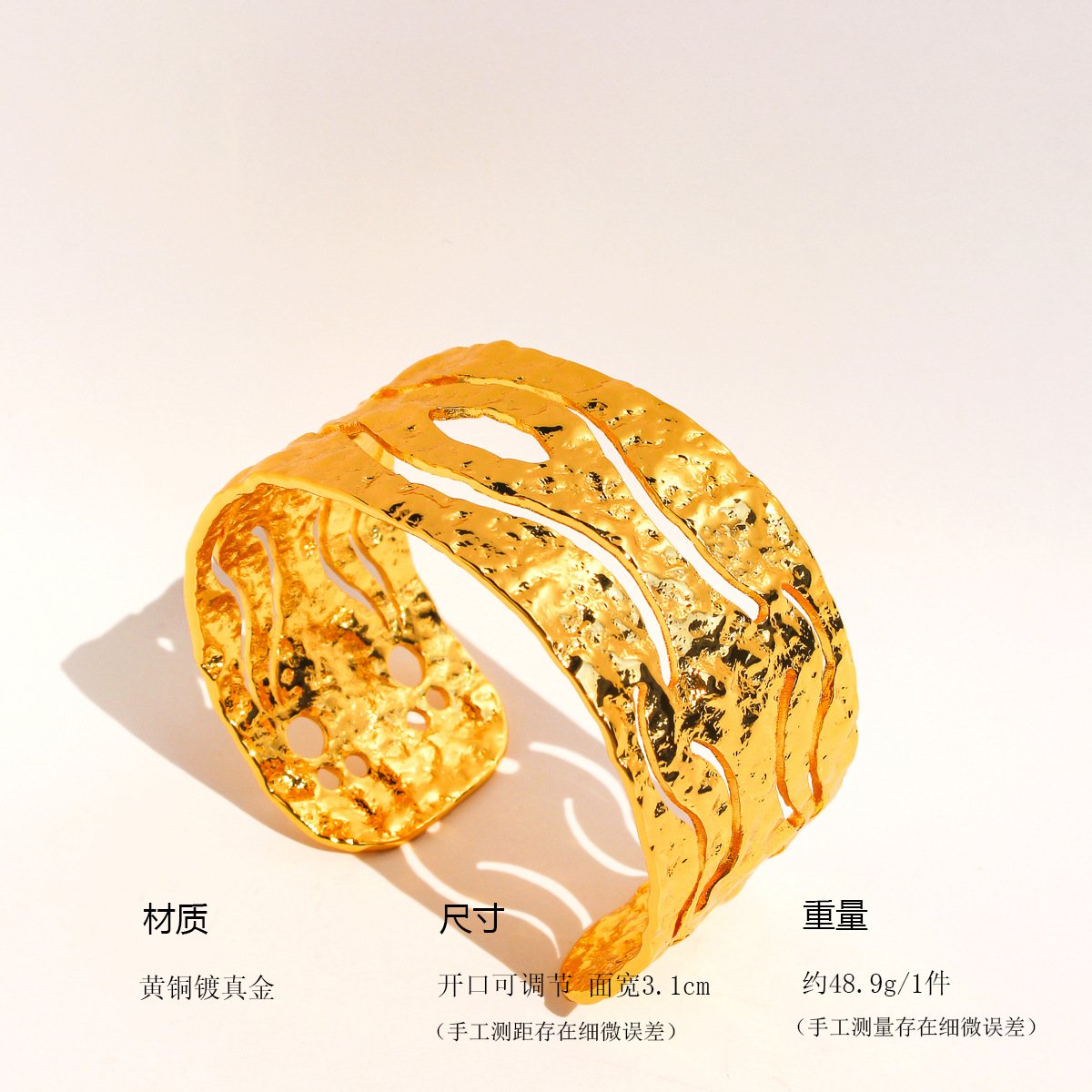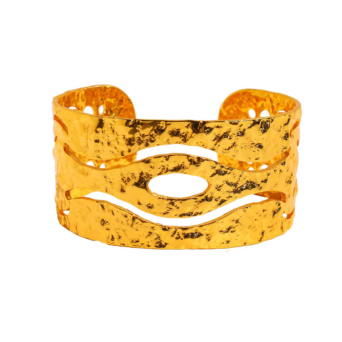 Introduce rustic charm to your jewelry collection with our Wholesale Hammered Texture Bracelet, featuring a wide open cuff design with authentic hammered and textured surface. Crafted from sturdy brass and plated with rich gold for a vintage-inspired finish, this bracelet offers a unique statement piece perfect for fashion retailers and cross-border wholesalers. Ideal for customers who appreciate artisanal details and bold accessories. Factory-direct pricing and free worldwide shipping from JuneJewelry.com ensure top value for bulk buyers.