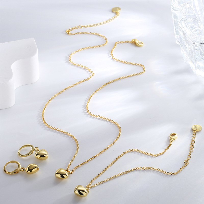 Add charm and cohesion to your jewelry collection with our Wholesale Heart Jewelry Set, featuring a matching necklace, bracelet, and earrings. Each piece is crafted from high-quality brass and expertly plated in real 18K gold, showcasing a clean and modern heart-shaped design. This minimalist yet elegant 3-piece set is perfect for fashion retailers, gift box bundles, and cross-border eCommerce sellers. The cohesive styling and timeless design appeal to customers looking for versatile, everyday elegance with a romantic touch. Available at factory-direct prices with free international shipping on all bulk orders at JuneJewelry.com.