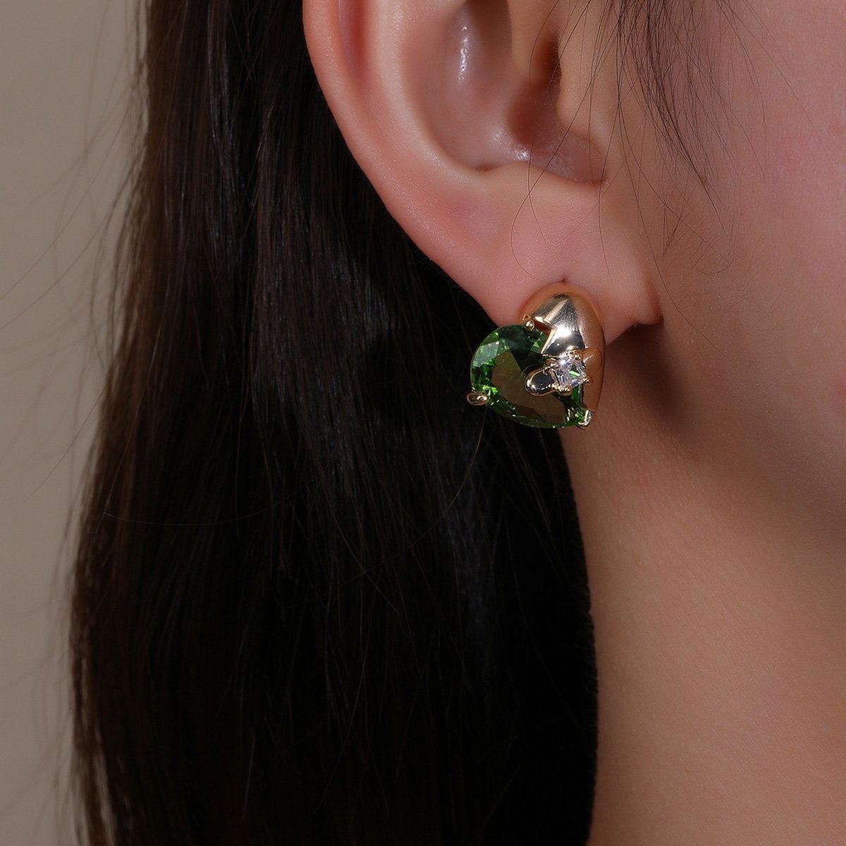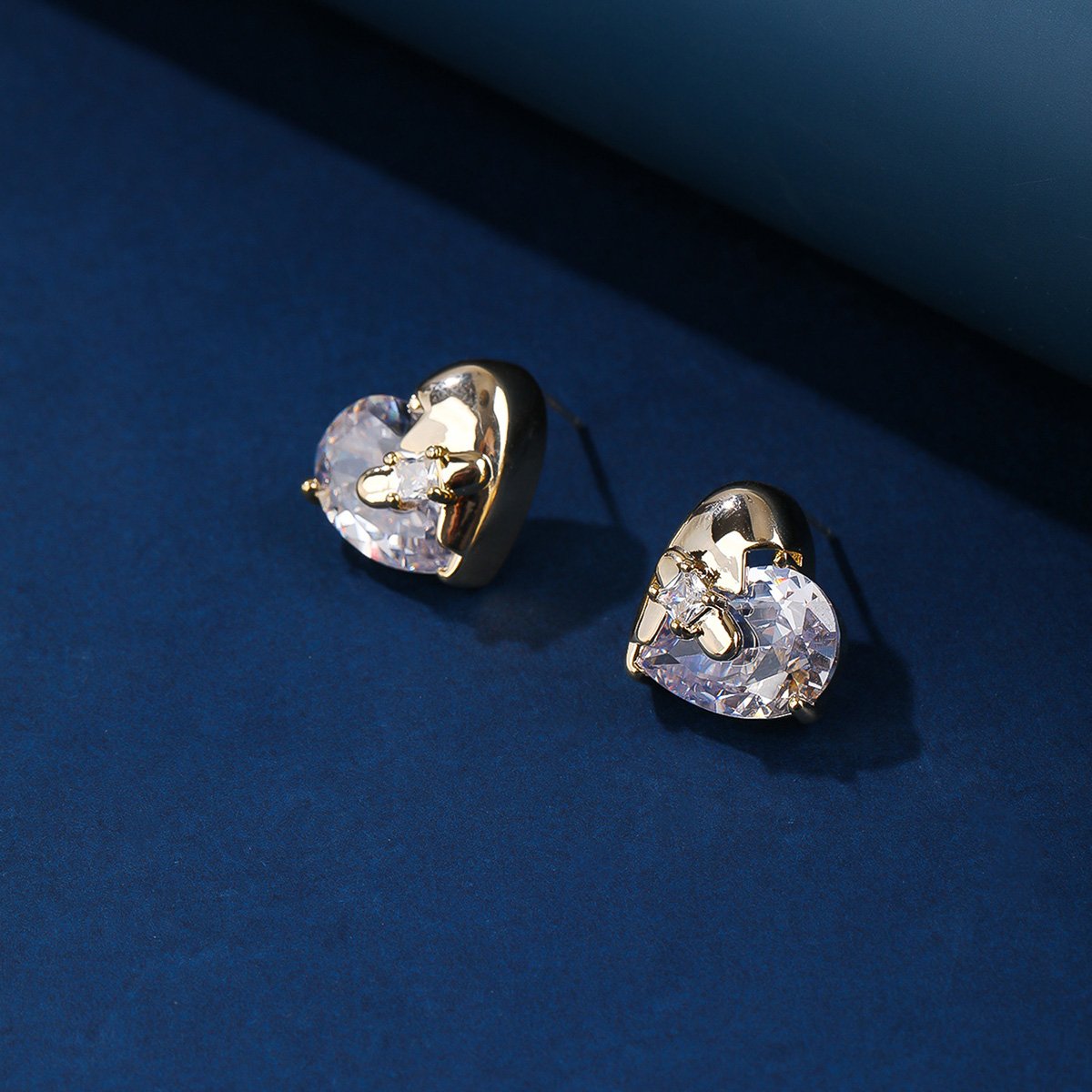 Capture hearts with our Wholesale Heart Stud Earrings. This charming and elegant design is a must-have for any jewelry collection. Each earring features a brilliant, heart-shaped clear zircon. The stone is set within a beautiful, polished gold-tone frame. A small, delicate bow detail adds a whimsical touch. These earrings are perfect for everyday wear or a special occasion.