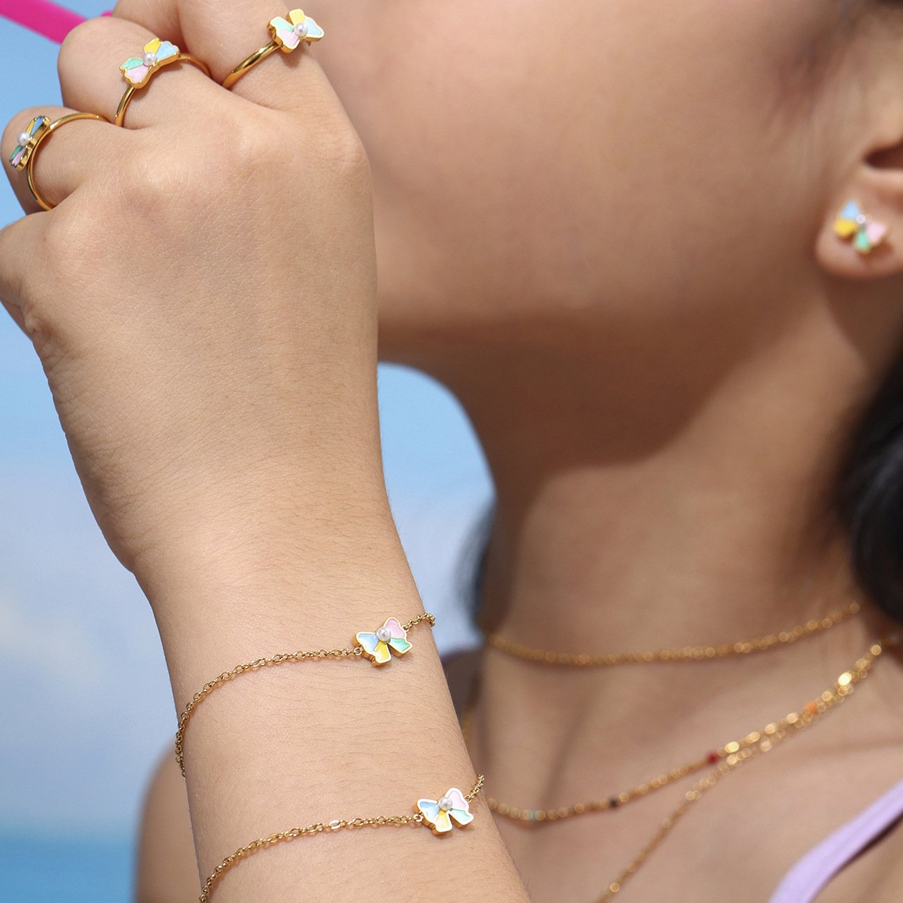 Celebrate Children’s Day or special occasions with our Wholesale Kids Bow Jewelry Set, designed in a sweet and playful schoolgirl style. This 4-piece set includes a colorful enamel bow necklace, bracelet, earrings, and ring, all crafted from durable stainless steel and plated with real 18K gold. The bright drip oil design adds a fun and cheerful touch, while the high-quality materials ensure safety and long-lasting wear for children. Perfect for birthdays, parties, or everyday wear, this set is ideal for retailers and boutiques looking for trendy kids jewelry wholesale collections at JuneJewelry.com.
