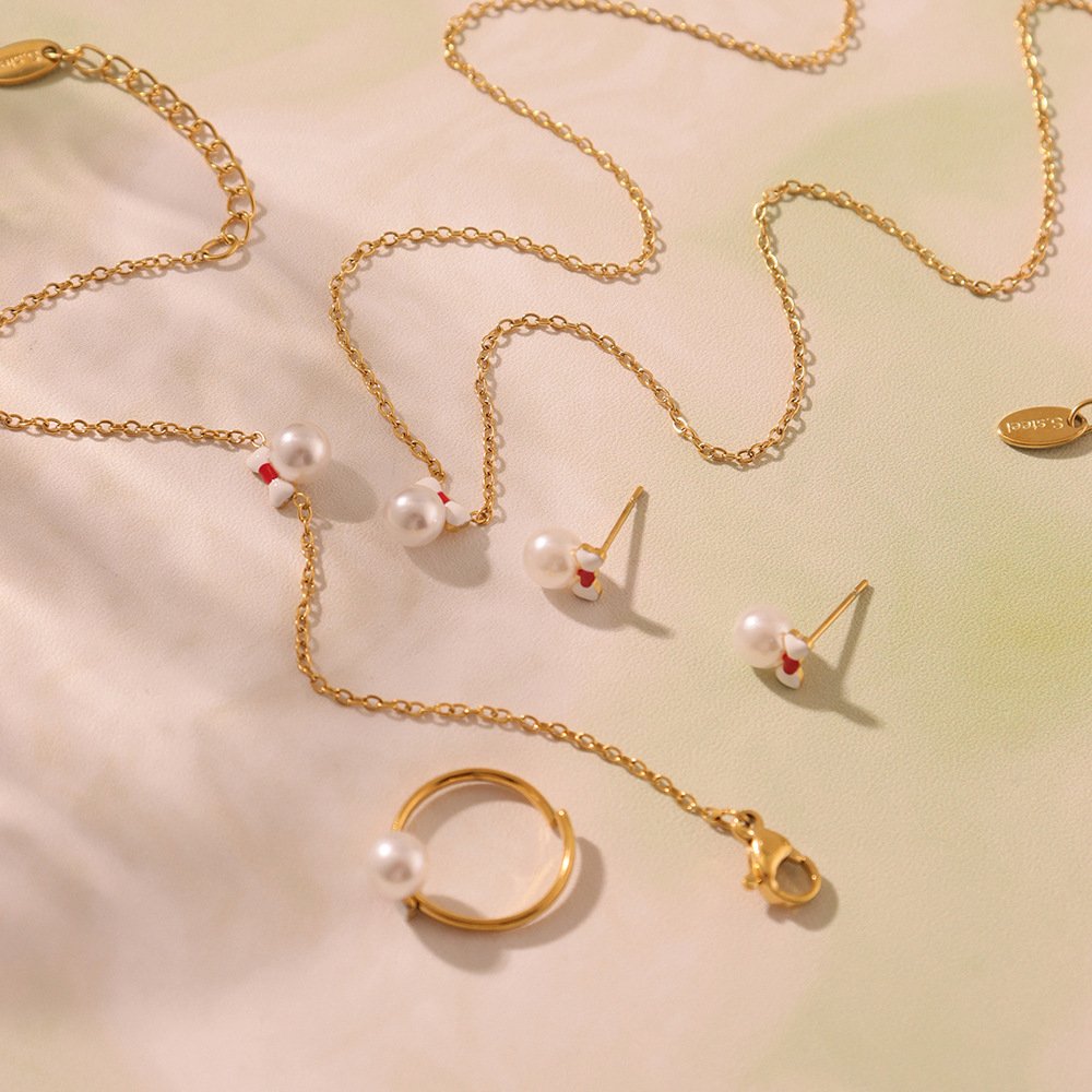 Add elegance and sweetness to children’s accessories with our Wholesale Kids Pearl Jewelry Set. Designed in a princess-inspired style, this set features a bow-knot necklace, bracelet, earrings, and ring, decorated with delicate pearls for a classy yet playful look. Crafted from stainless steel with real 18K gold plating, the jewelry is safe for children, durable, and resistant to tarnishing. Perfect for birthdays, parties, Children’s Day gifts, and everyday wear, this jewelry set combines charm with high quality. Retailers and boutique owners can count on JuneJewelry.com to supply fashionable kids jewelry wholesale collections that parents and children love.