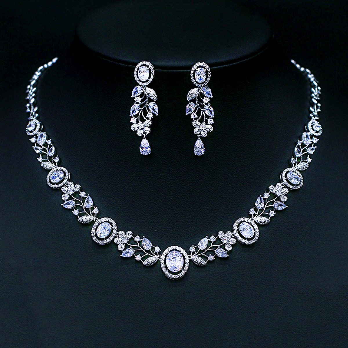Elevate your collection with our charming wholesale leaf design cubic zirconia jewelry set. This elegant ensemble features a necklace and matching dangle earrings, adorned with brilliant, high-quality cubic zirconia stones set within intricate leaf and vine motifs. The original, unique design offers a delicate yet sophisticated appeal, perfect for adding a touch of nature-inspired sparkle to everyday wear or special occasions. Crafted from durable brass and expertly plated with platinum, this set ensures lasting beauty and exceptional shine.