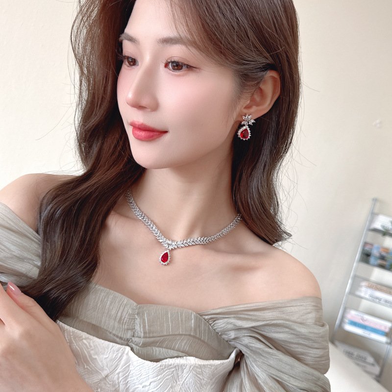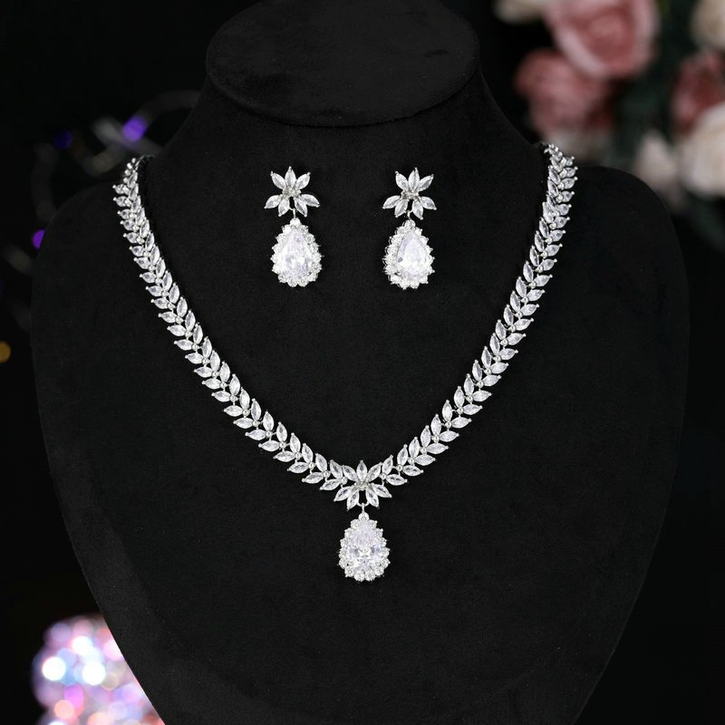 Crafted from premium brass and plated in brilliant white gold, this jewelry set showcases exquisite craftsmanship and a high-end shine that rivals fine jewelry. The delicate drop-shaped earrings and matching necklace bring out a graceful and luxurious vibe, ideal for weddings, banquets, and red carpet events.