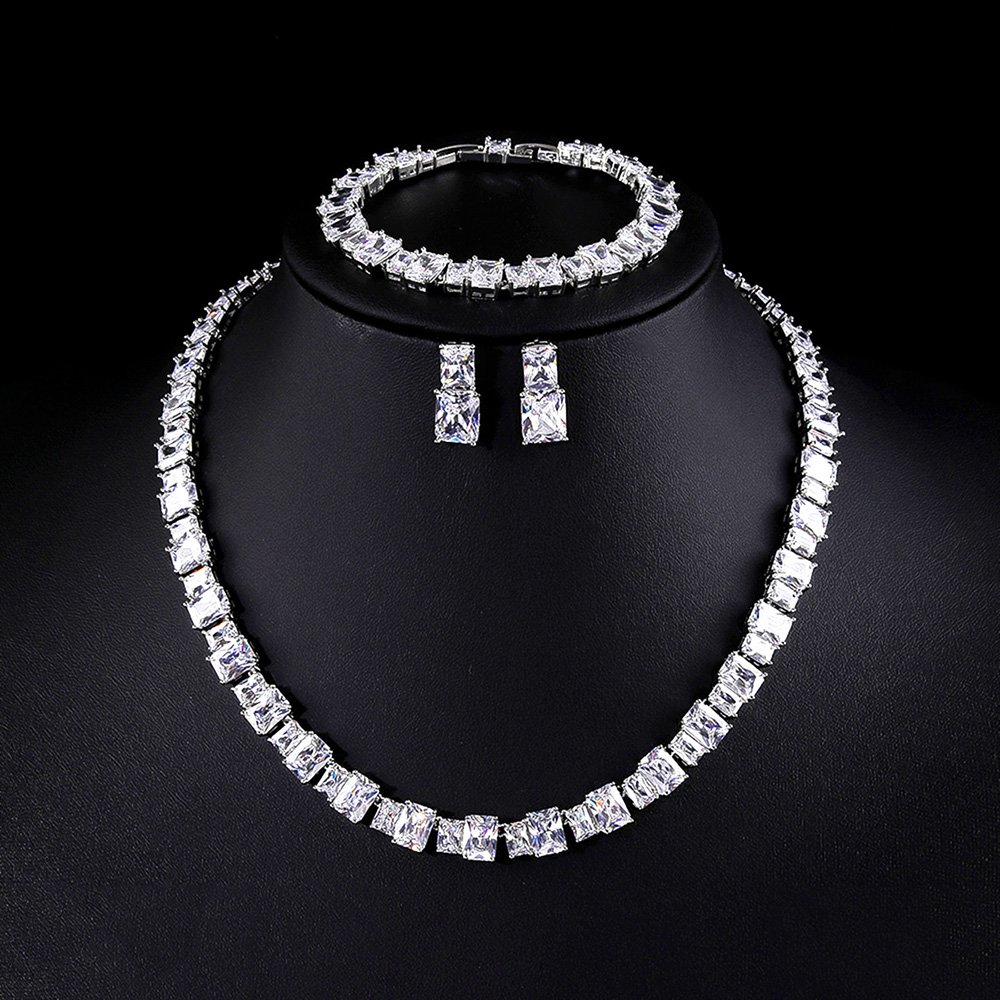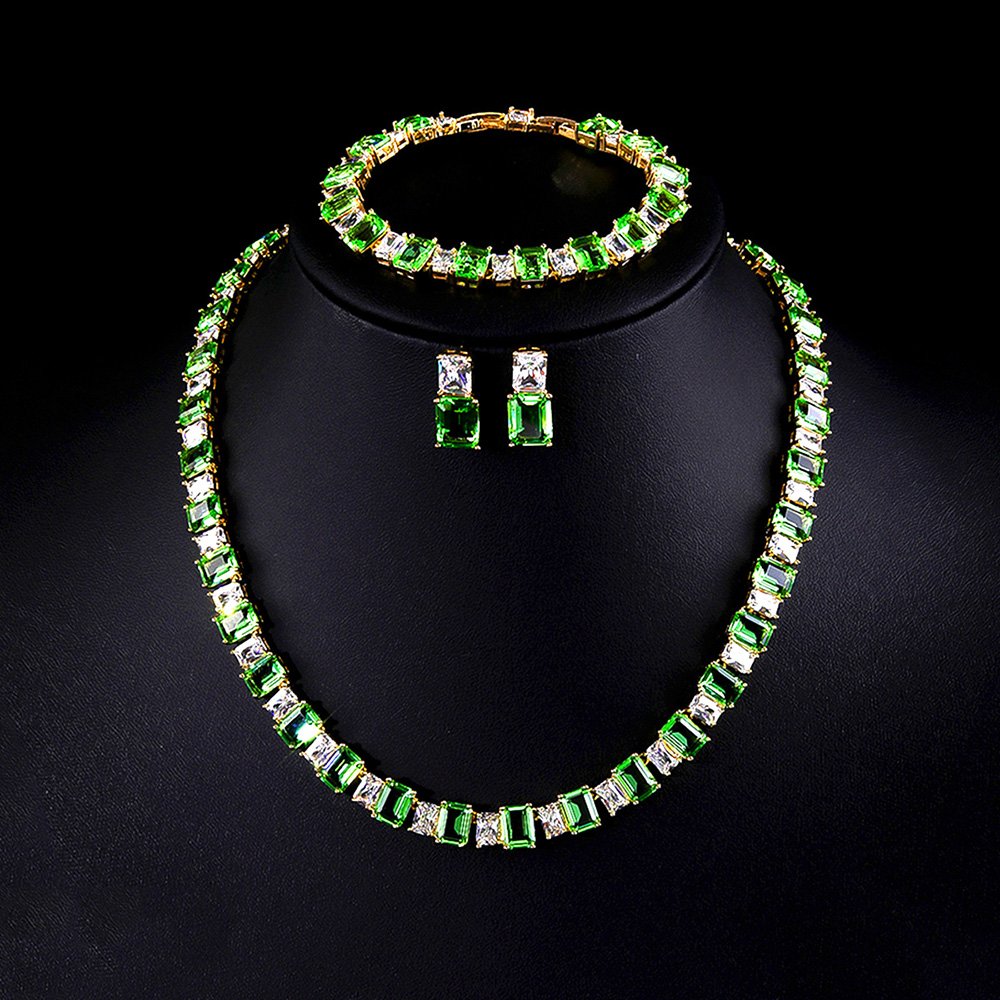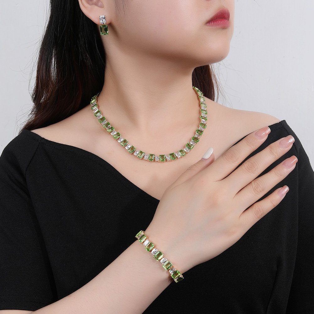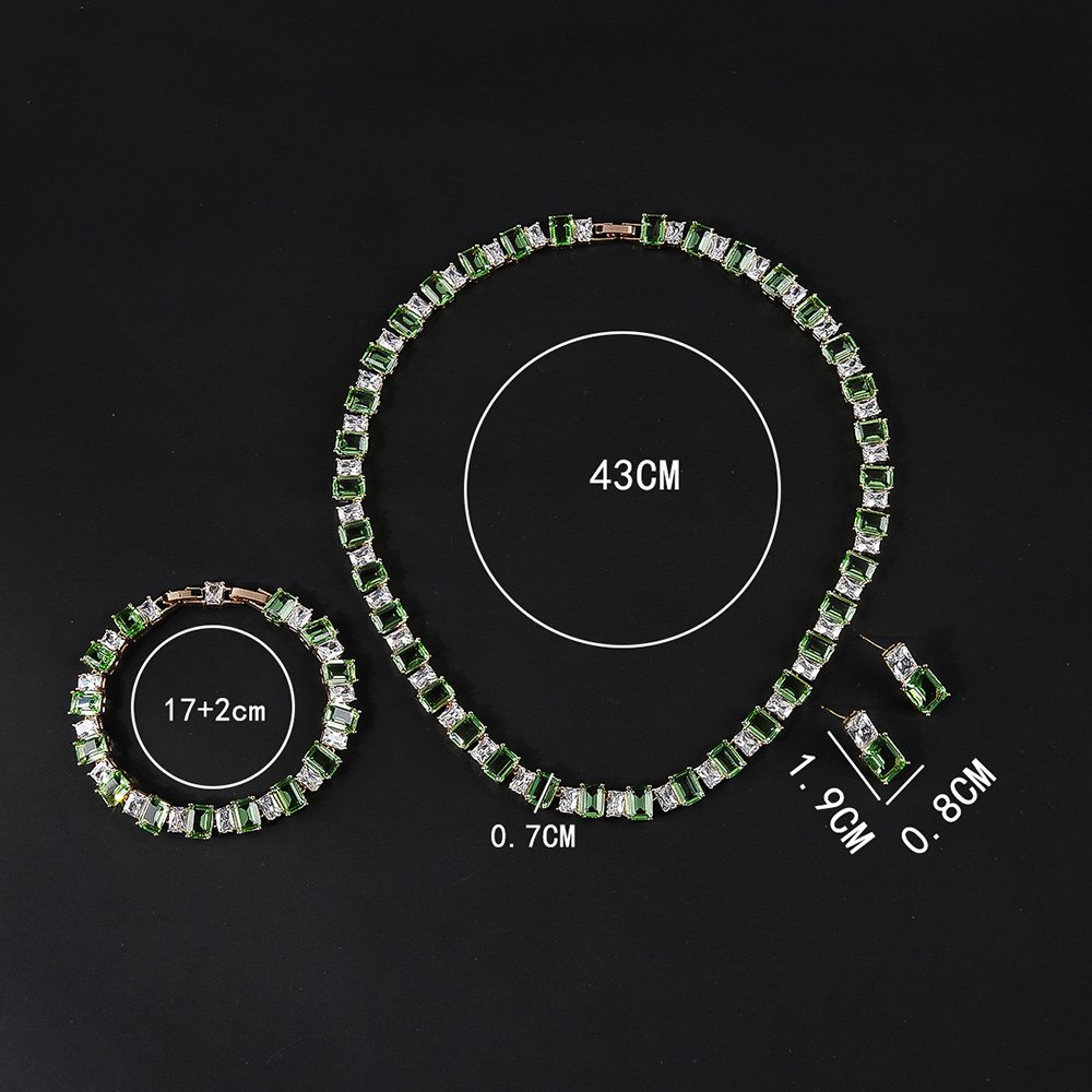 Wholesale Luxury Zircon Set offers a breathtaking aesthetic that combines classic sophistication with high-end modern jewelry craftsmanship. We manufacture this exquisite jewelry ensemble using a high-quality copper base and professional-grade real gold plating for lasting shine. The necklace and matching earrings feature stunning, radiant emerald-cut zircon stones that sparkle brilliantly from every single angle.