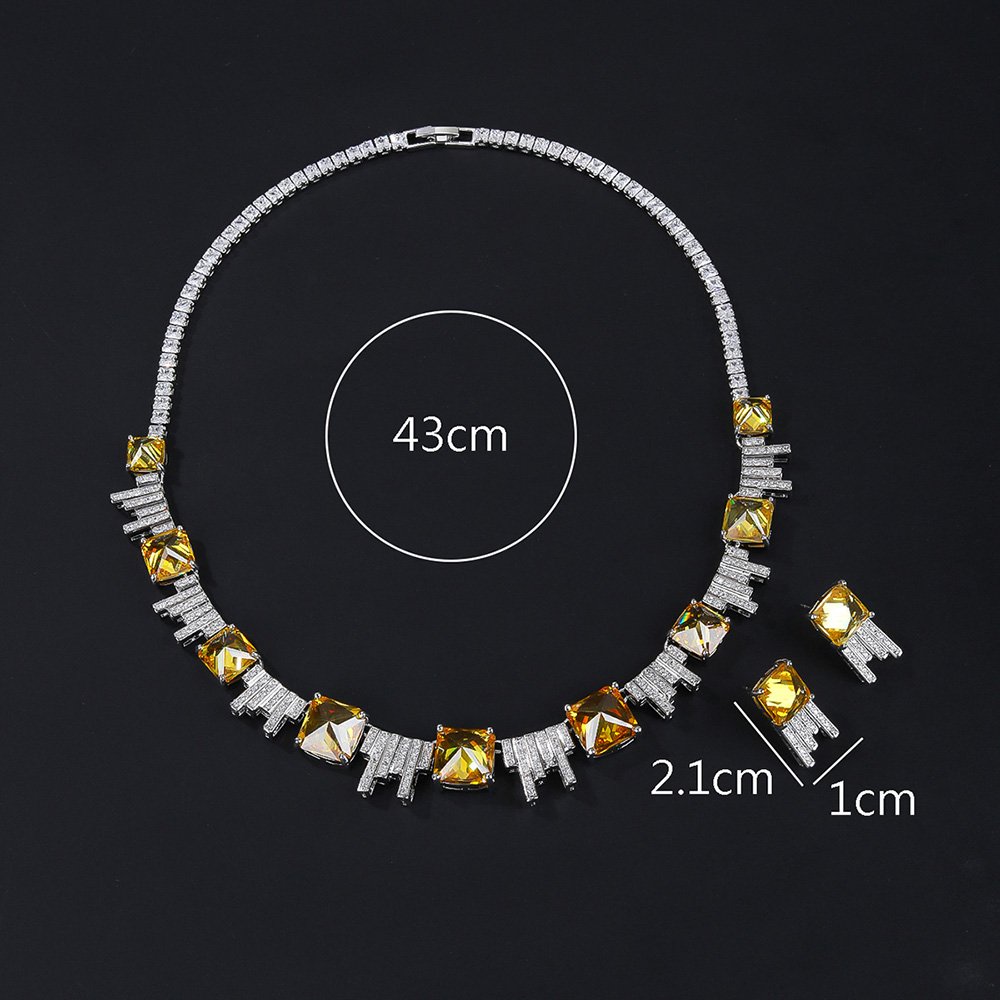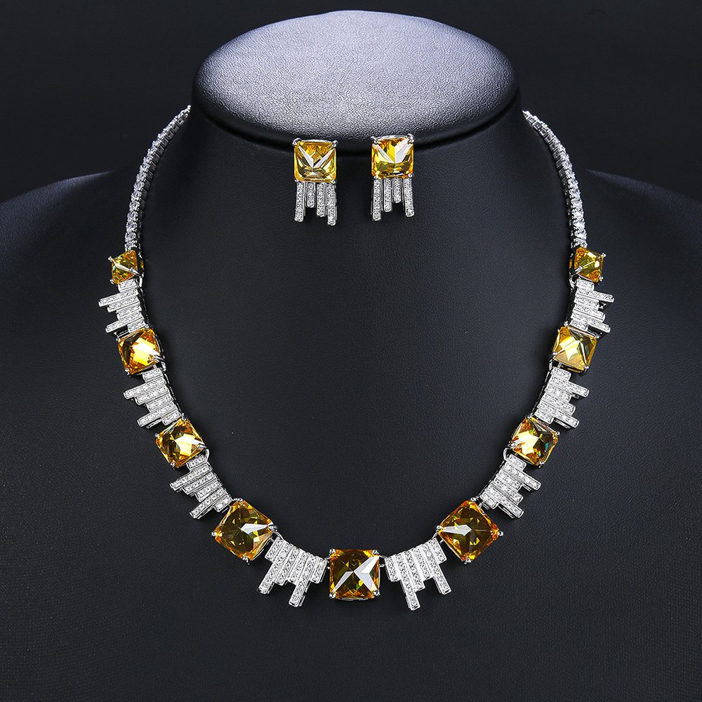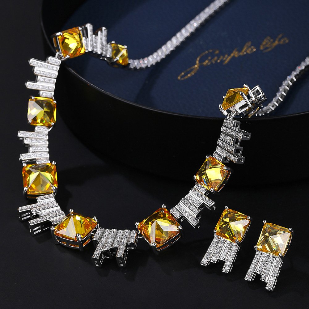 Wholesale luxury zircon set with yellow cushion-cut stones and gold plated copper from JuneJewelry.com – high-quality 925 silver needle bridal jewelry.
