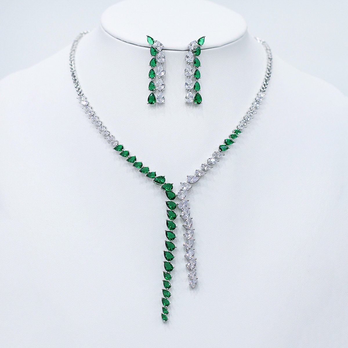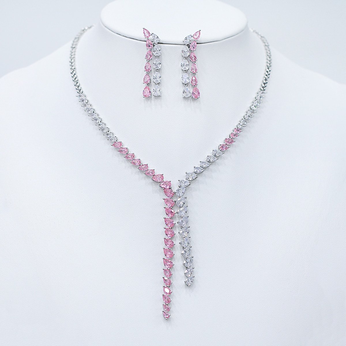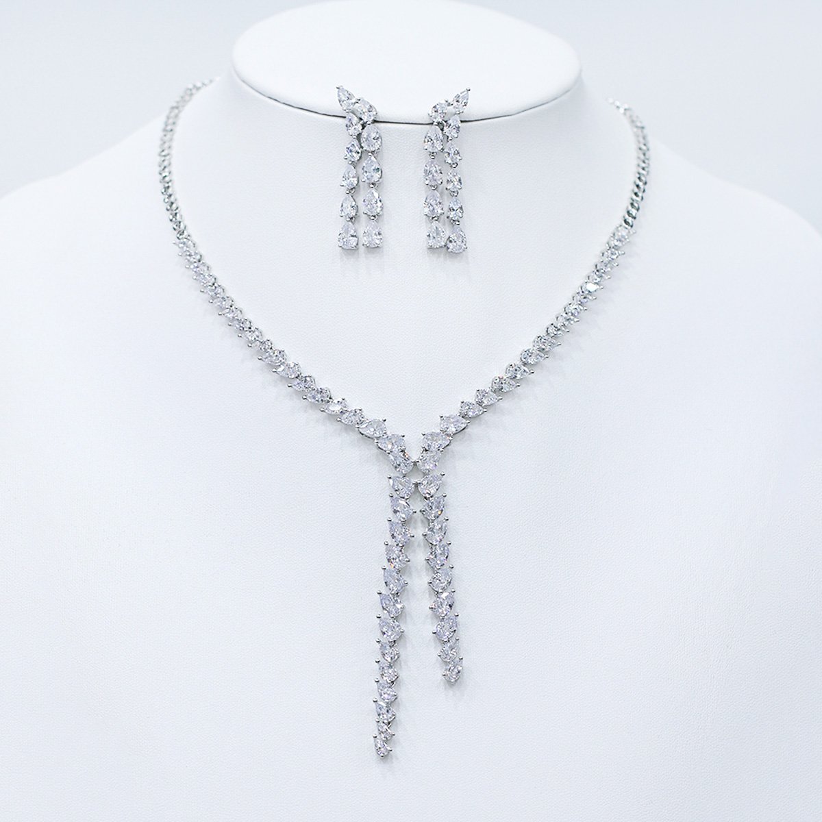 Present unique elegance with our wholesale marquise cascading Y-drop set, meticulously crafted from high-quality copper and lustrously platinum-plated for enduring brilliance. This original and unique design features a striking Y-drop necklace with a continuous cascade of shimmering marquise-cut stones, creating a sophisticated and glamorous look. Paired with long, cascading drop earrings, this set is a perfect ensemble for any formal occasion, from red carpet events to elegant dinners. Ideal for boutiques, online jewelry stores, and cross-border eCommerce sellers, this set is a must-have for customers seeking high-quality, modern accessories. Benefit from our competitive factory-direct pricing and enjoy free worldwide shipping, ensuring exceptional value and profitability for all your bulk purchases at JuneJewelry.com.