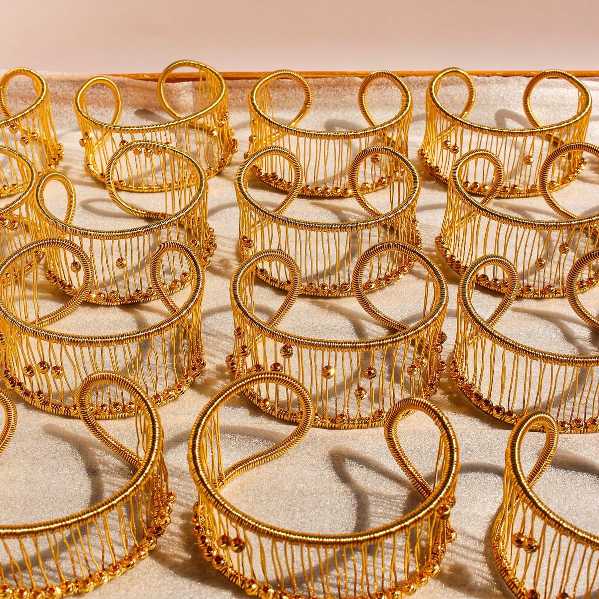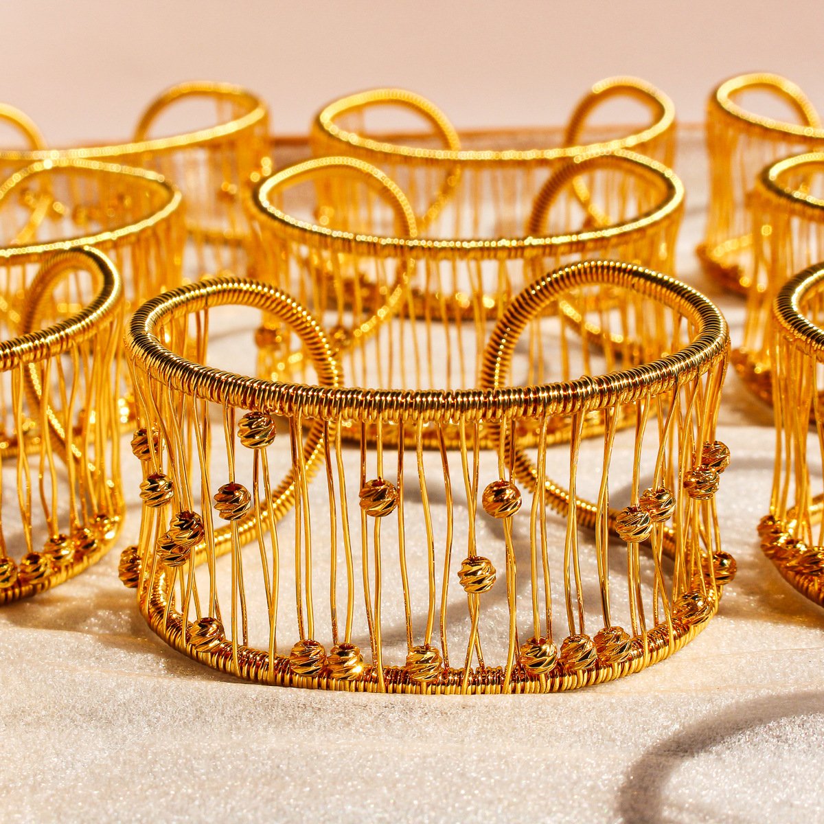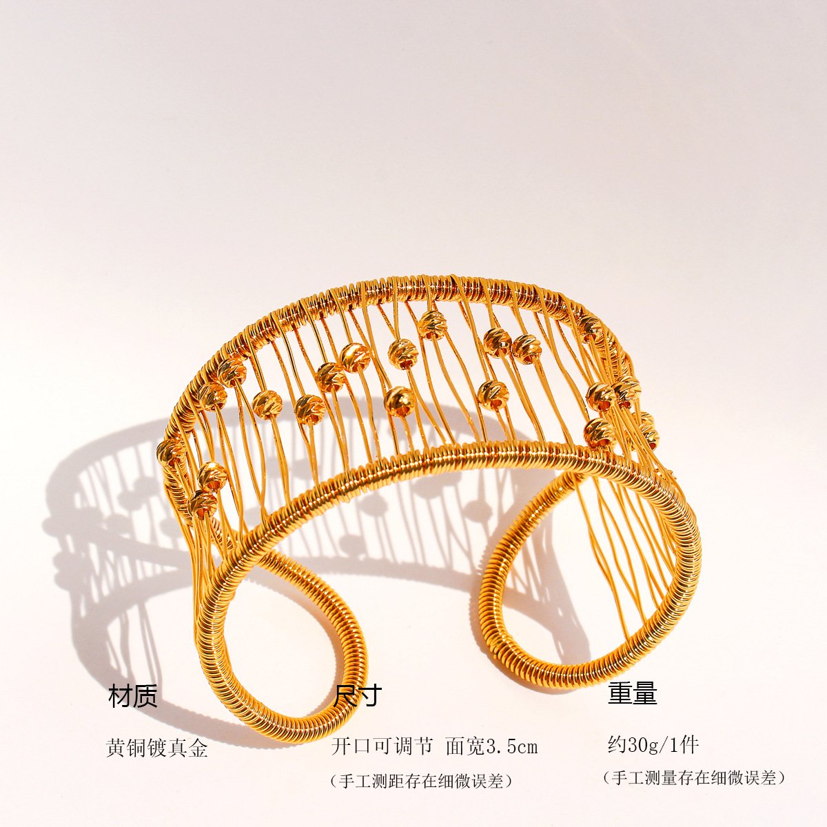 Introduce artisan style with our Wholesale Mesh Cuff Bracelet, a handcrafted statement piece that blends intricate wire wrapping with a bold, hollow mesh design. This wide open bangle is made from high-quality brass and luxuriously plated in 18K gold, accented with golden bead details for added texture and dimension. The artistic construction and eye-catching geometry make it ideal for boutiques, jewelry retailers, and cross-border fashion wholesalers seeking standout pieces. Lightweight yet durable, this bracelet is perfect for modern women who appreciate unique, handcrafted accessories. Available at factory prices with free global shipping from JuneJewelry.com.