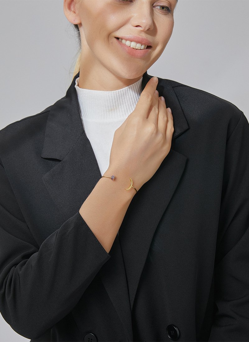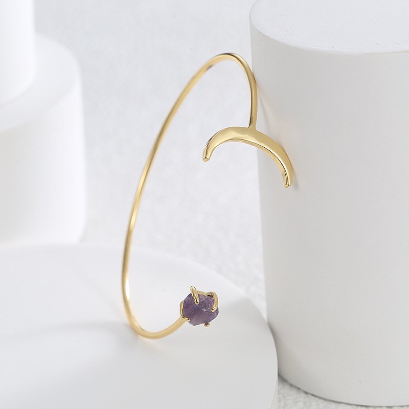Discover our wholesale moon cuff bracelet. This minimalist, European-style open cuff design, crafted from 14K gold plated copper, features a delicate moon design with a purple stone accent. This chic and adjustable bracelet adds a touch of celestial elegance to any outfit.