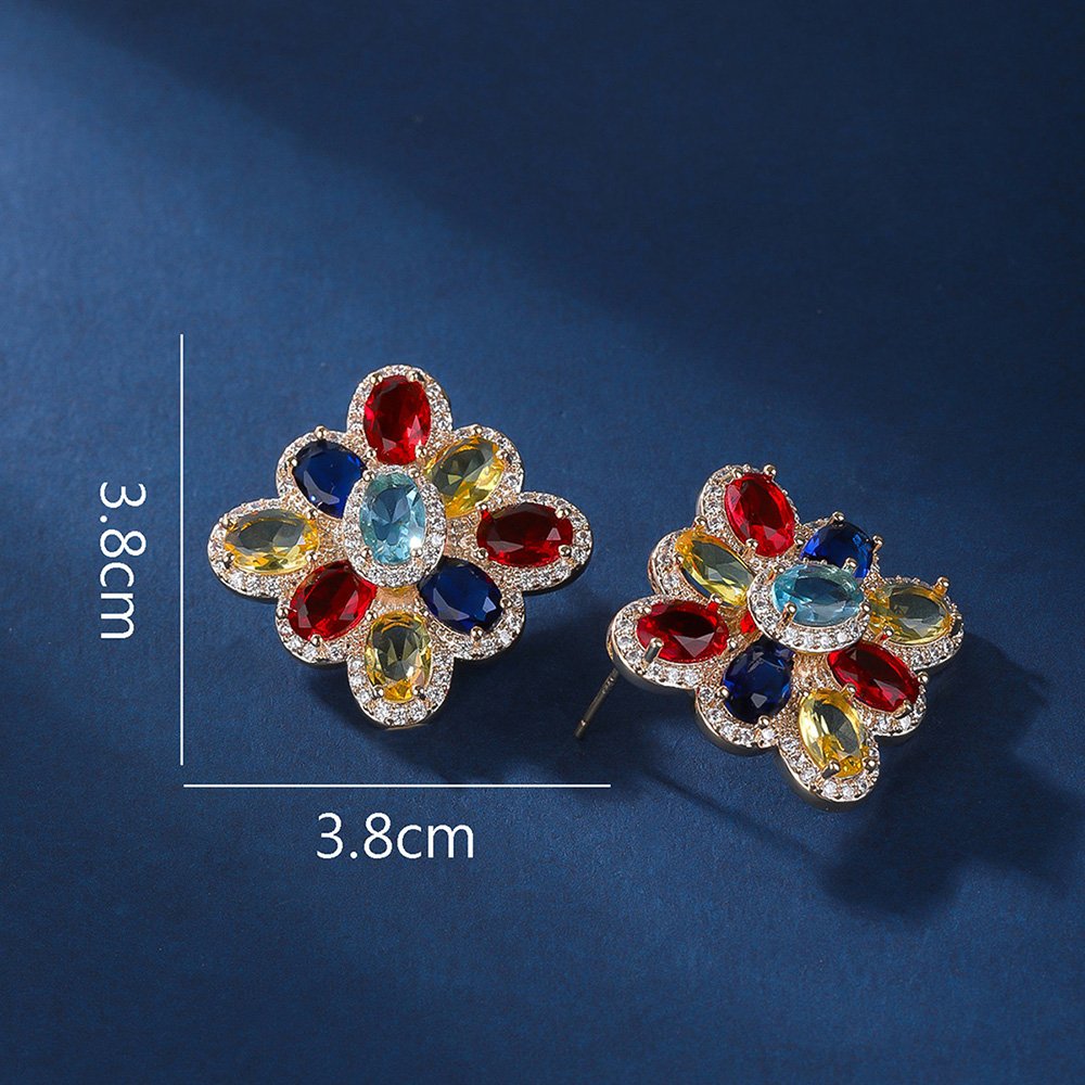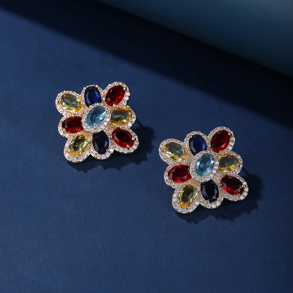 Wholesale multicolor flower earrings with red, blue, and yellow zircons on 14K gold plated brass from JuneJewelry.com – luxury floral jewelry for bulk orders.
