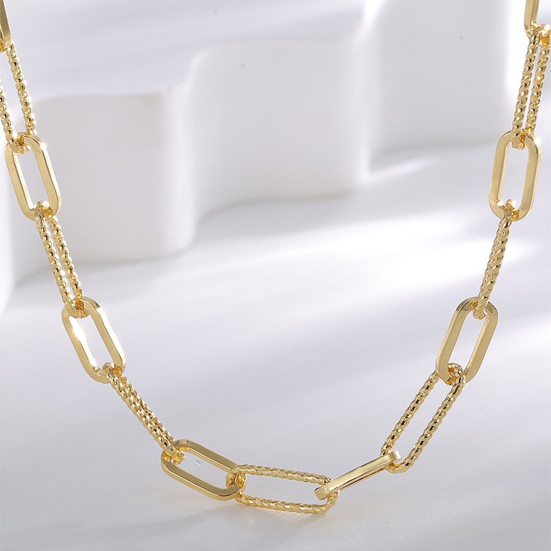 Upgrade your jewelry collection with our Wholesale Paperclip Chain Necklace, featuring a trendy hip-hop inspired paperclip design. Made from high-quality brass and plated in luxurious 18K gold, this minimalist yet bold necklace adds a modern edge to any outfit. Its lightweight, versatile structure makes it ideal for layering or wearing alone, perfect for fashion-forward women seeking both elegance and attitude. A must-have for boutique owners, jewelry retailers, and cross-border sellers looking for high-margin, on-trend pieces. Enjoy factory-direct pricing, premium quality, and free global shipping from JuneJewelry.com — your trusted wholesale fashion jewelry supplier.