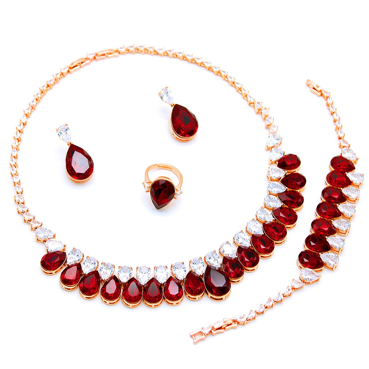 Wholesale Teardrop Crystal Jewelry Set with rose gold plating and multi-color crystals – necklace, bracelet, ring, and earrings from JuneJewelry.com factory price.