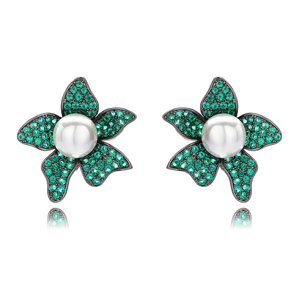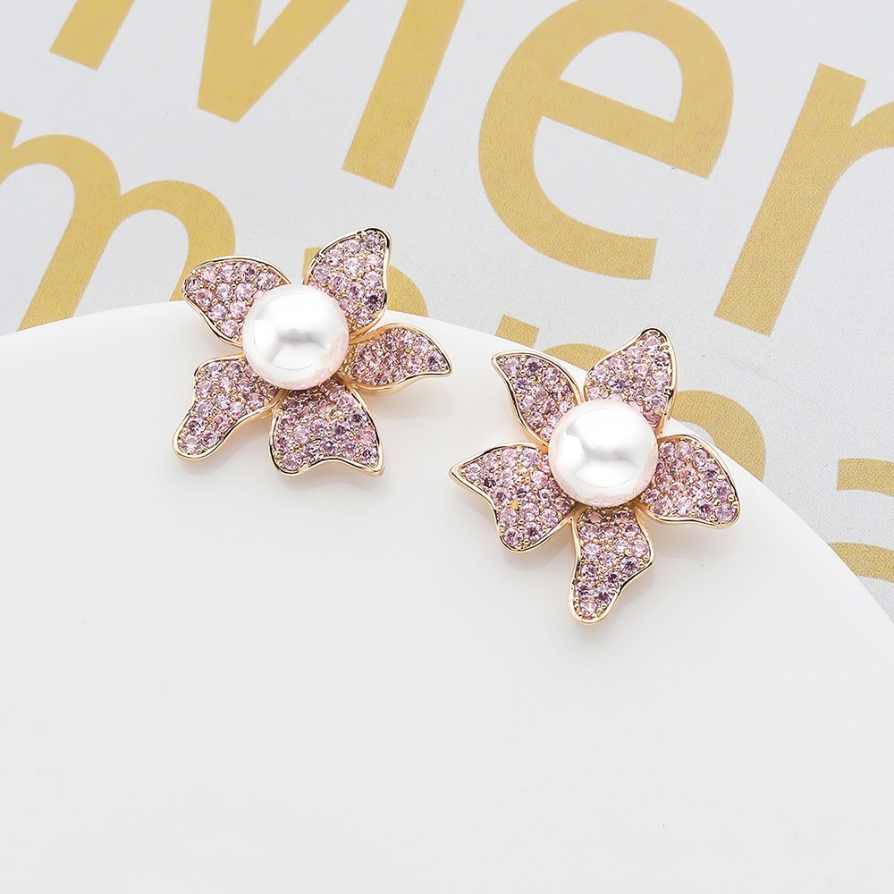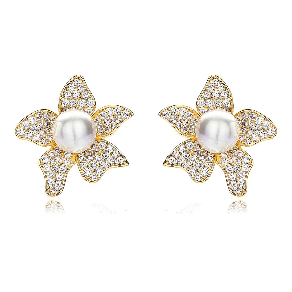 Wholesale pearl flower earrings with micro-pavé zircons and 925 silver needles on 14K gold plated brass from JuneJewelry.com – luxury floral jewelry for bulk orders.