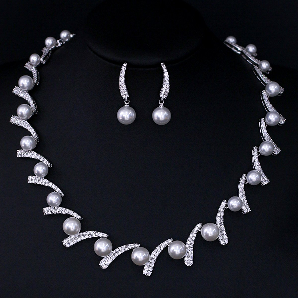 Wholesale pearl and swirl motif necklace and earring set with platinum plating from JuneJewelry.com – modern copper bridal fashion jewelry for bulk orders.