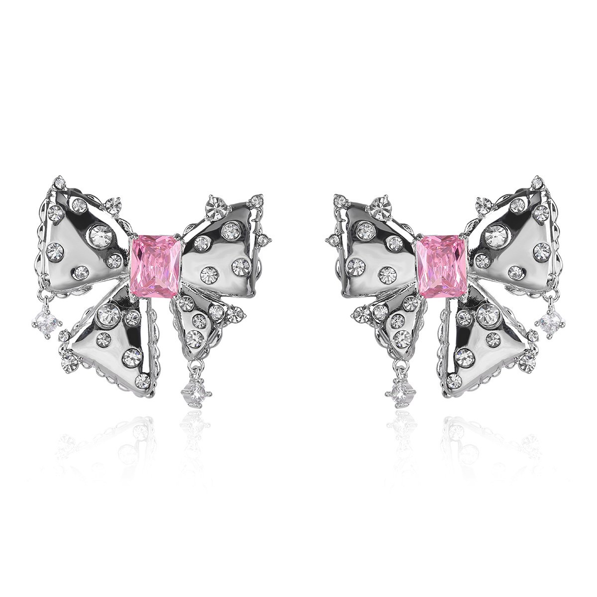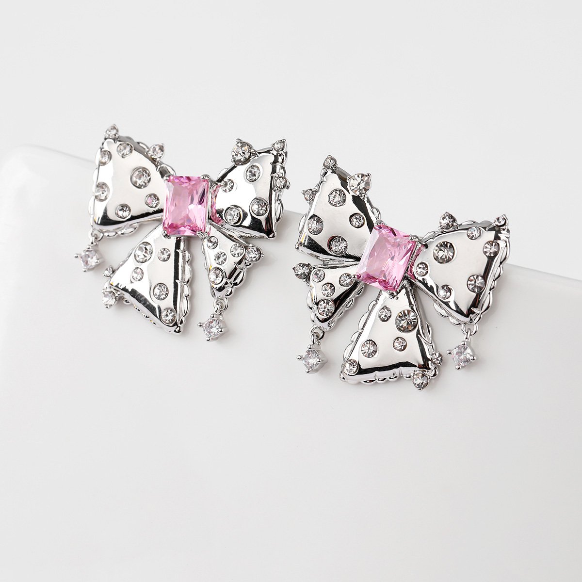 Wholesale zircon bow earrings with a cushion-cut pink center stone and cubic zirconia accents, platinum plated with a 925 silver needle, from JuneJewelry.com.