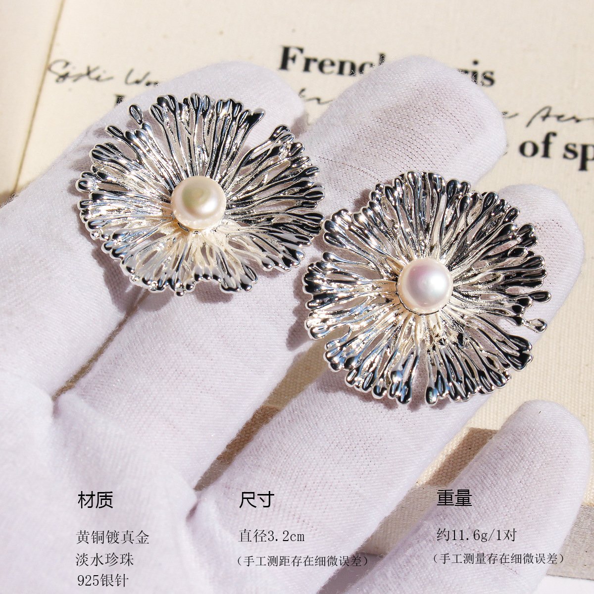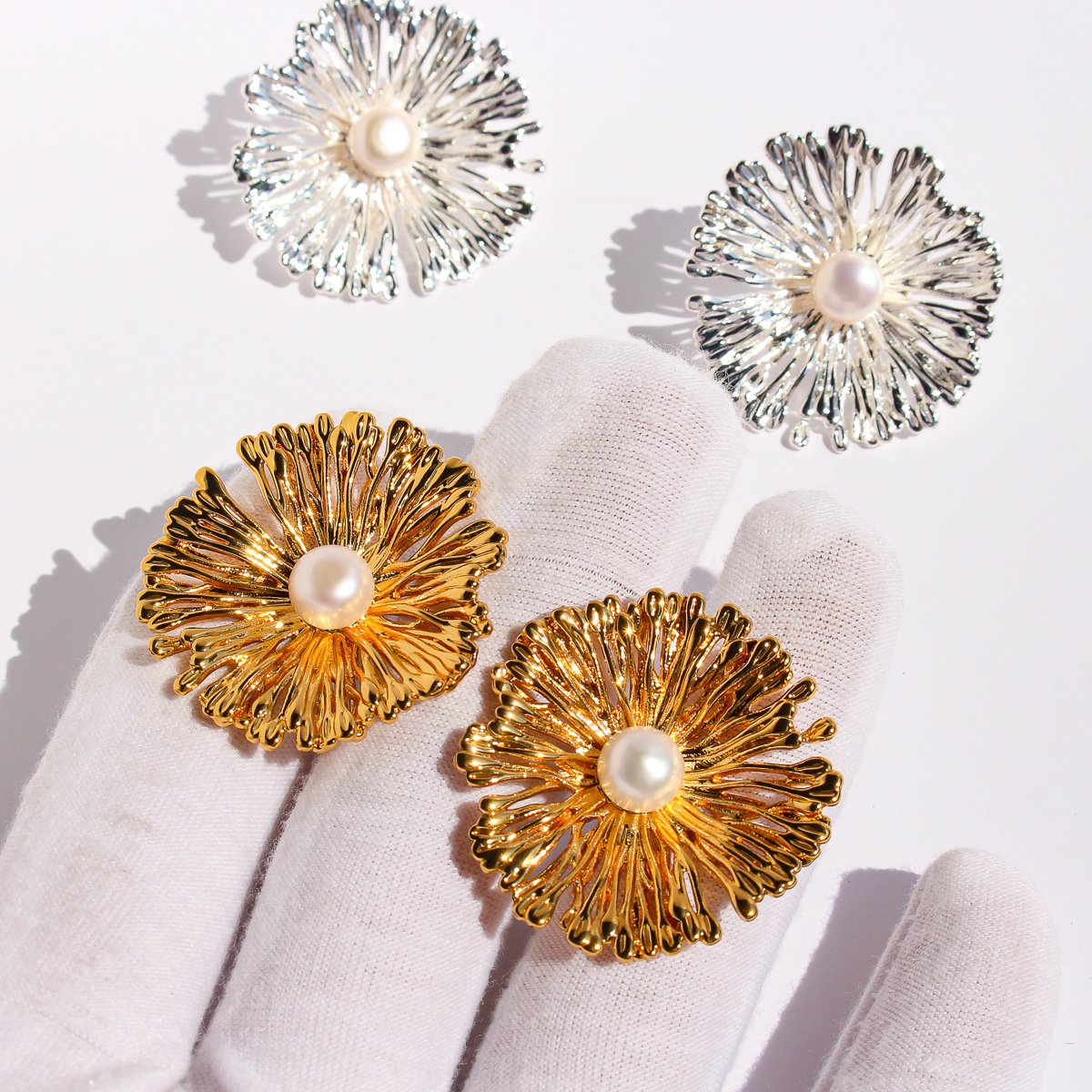 Discover our wholesale statement flower earrings, featuring a dazzling firework design with delicate pearl accents and a luxurious hollow structure. Available in 18K gold and platinum plated copper. Shop unique, high-quality statement flower earrings wholesale with free shipping at junejewelry.com!